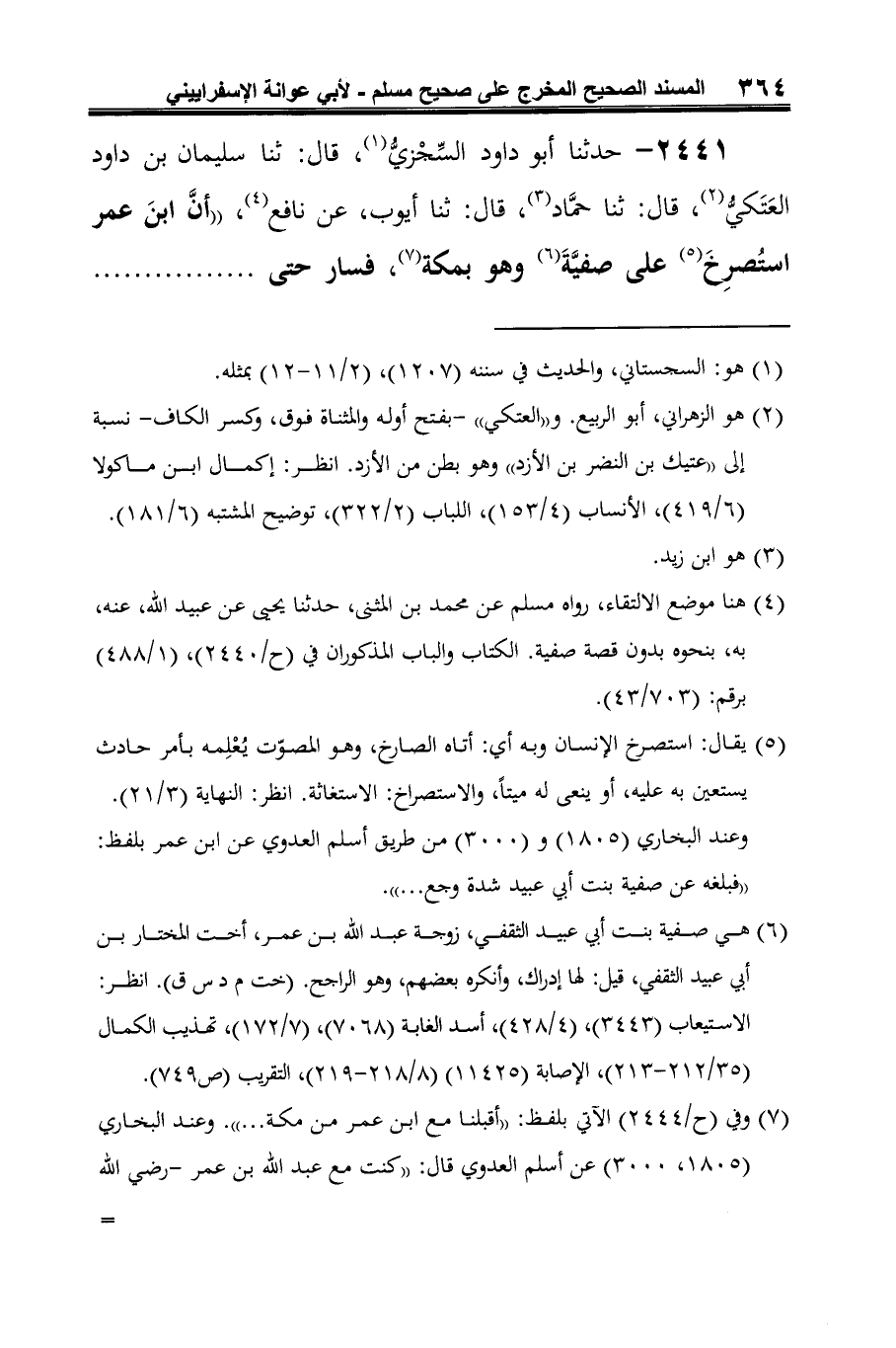 2441 - حدّثنا أبو داود السِّجْزيُّ (¬1)، قال: ثنا سليمان بن داود العَتَكيُّ (¬2)، قال: ثنا حمَّاد (¬3)، قال: ثنا أيوب، عن نافع (¬4)، "أنَّ ابنَ عمر استُصرِخَ (¬5) على صفيَّةَ (¬6) وهو بمكة (¬7)، فسار حتّى