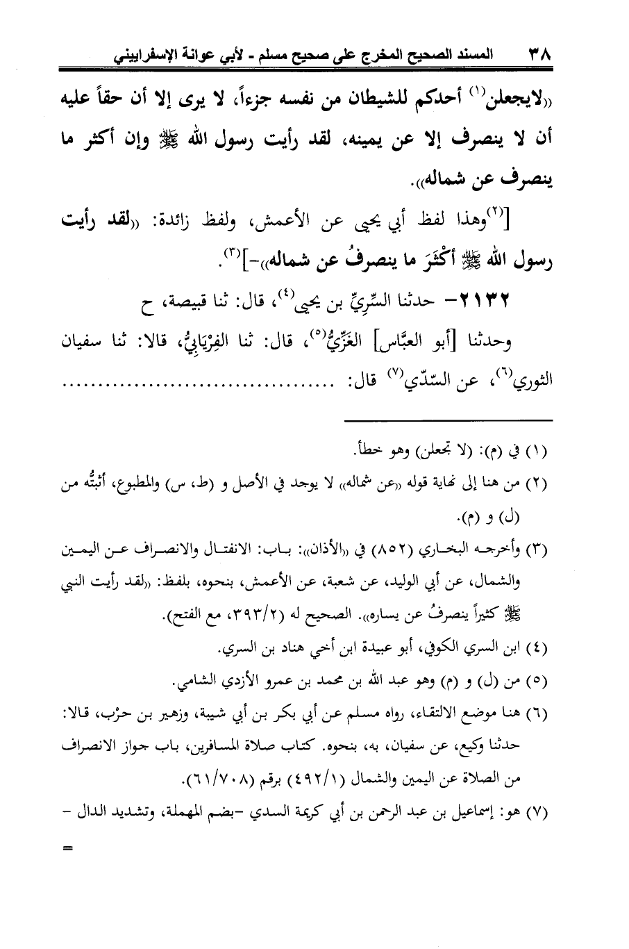 (¬3) هنا موضع الالتقاء، رواه مسلم عن أبي بكر بن أبي شيبة، وزهير بن حرْب، قالا: حدثنا وكيع، عن سفيان، به، بنحوه. كتاب صلاة المسافرين، باب جواز الانصراف من الصلاة عن اليمين والشمال (1/ 492) برقم (708/ 61).