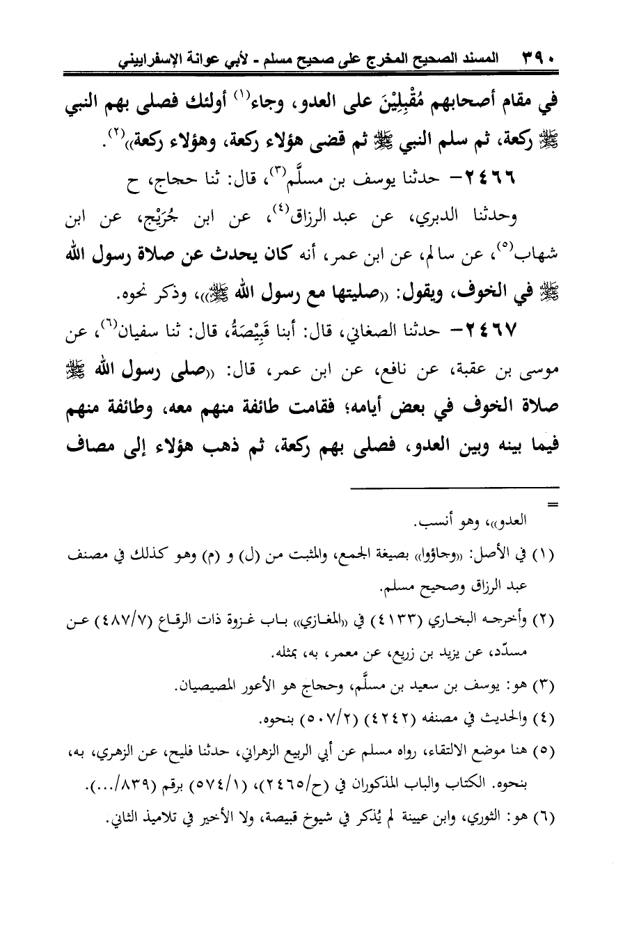2467 - حدّثنا الصغاني، قال: أبنا قَبِيْصَةُ، قال: ثنا سفيان (¬1)، عن موسى بن عقبة، عن نافع، عن ابن عمر، قال: "صلّى رسول الله -صلى الله عليه وسلم- صلاة الخوف في بعض أيامه؛ فقامت طائفة منهم معه، وطائفة منهم فيما بينه وبين العدو، فصلّى بهم ركعة، ثمّ ذهب هؤلاء إلى مصاف
