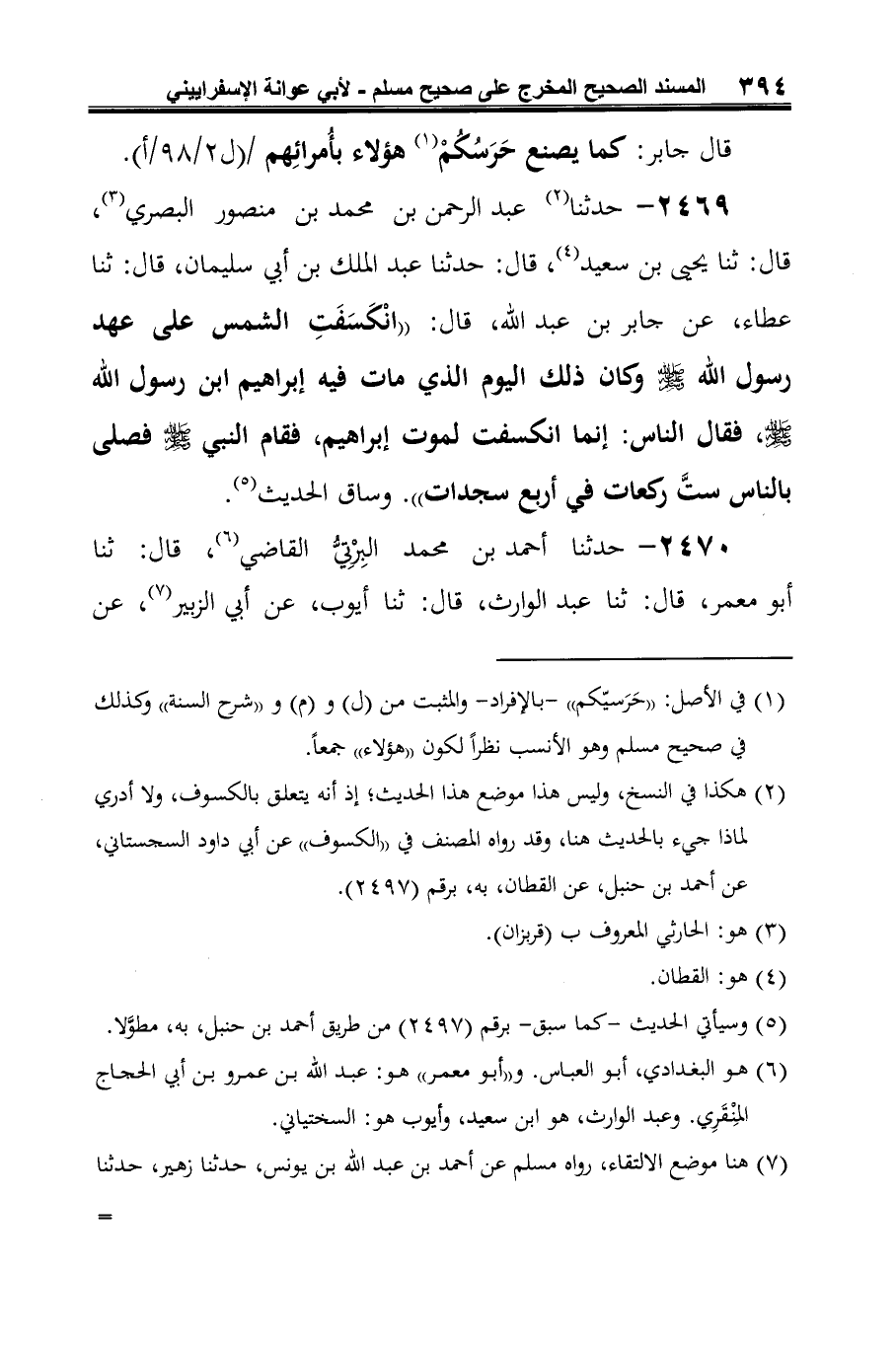 2469 - حدّثنا (¬1) عبد الرّحمن بن محمد بن منصور البصري (¬2)، قال: ثنا يحيى بن سعيد (¬3)، قال: حدّثنا عبد الملك بن أبي سليمان، قال: ثنا عطاء، عن جابر بن عبد الله، قال: "انْكَسَفَتِ الشّمس على عهد رسول الله -صلى الله عليه وسلم- وكان ذلك اليوم الّذي مات فيه إبراهيم ابن رسول الله -صلى الله عليه وسلم-، فقال النَّاس: إنّما انكسفت لموت إبراهيم، فقام النّبيّ -صلى الله عليه وسلم- فصلّى بالناس ستَّ ركعات في أربع سجدات". وساق الحديث (¬4).
