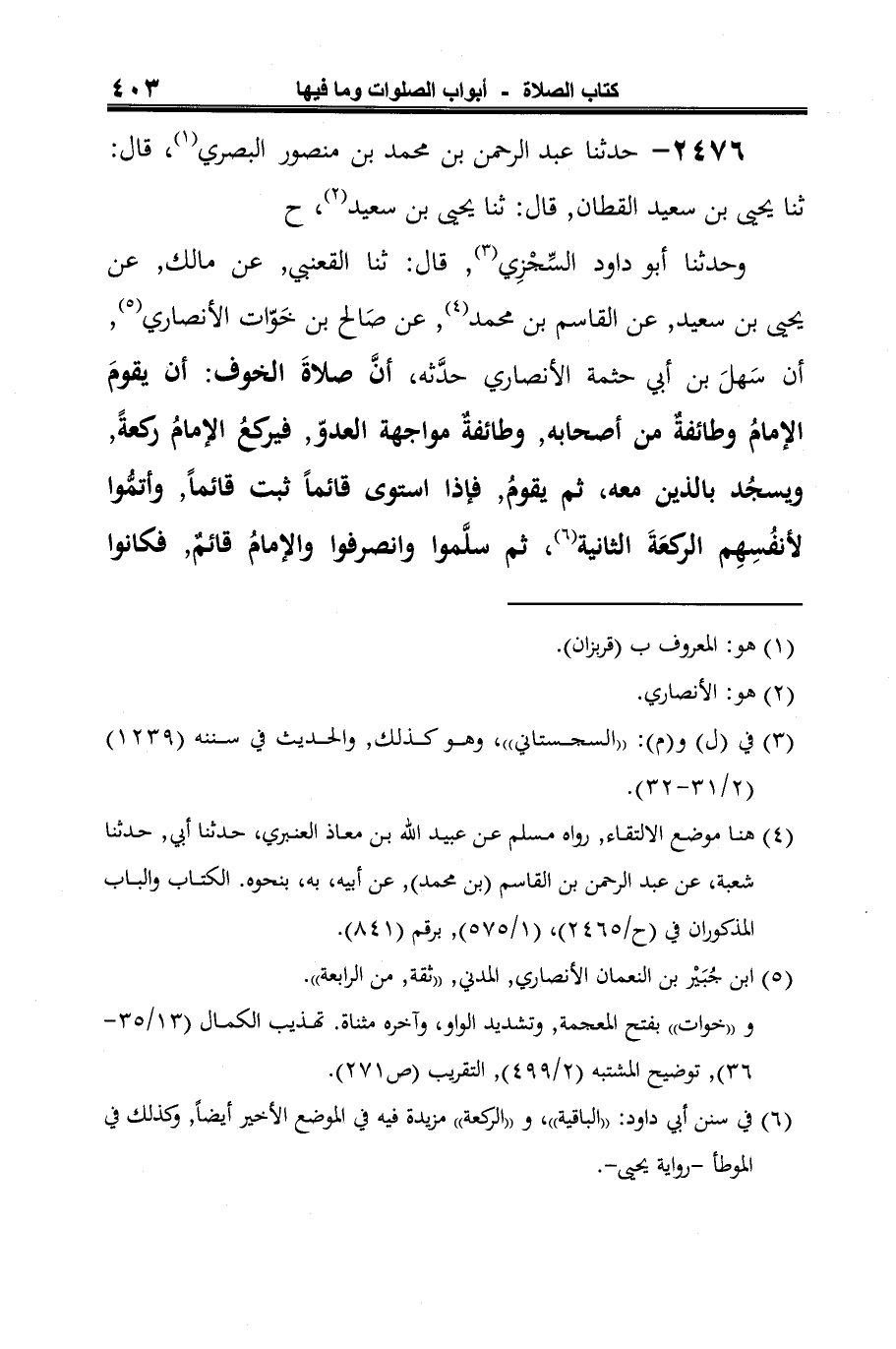 وحدثنا أبو داود السِّجْزِي (¬3)، قال: ثنا القعنبي، عن مالك، عن يحيى بن سعيد، عن القاسم بن محمّد (¬4)، عن صَالح بن خَوّات الأنصاري (¬5)، أن سَهلَ بن أبي حثمة الأنصاري حدَّثه، أنَّ صلاةَ الخوف: أن يقومَ الإمامُ وطائفةٌ من أصحابه، وطائفةٌ مواجهة العدوِّ، فيركعُ الإمامُ ركعةً، ويسجُد بالذين معه، ثمّ يقومُ، فإذا استوى قائمًا ثبت قائمًا، وأتمُّوا لأنفُسِهِم الركعَةَ الثّانية (¬6)، ثمّ سلَّموا وانصرفوا والإمامُ قائمٌ، فكانوا