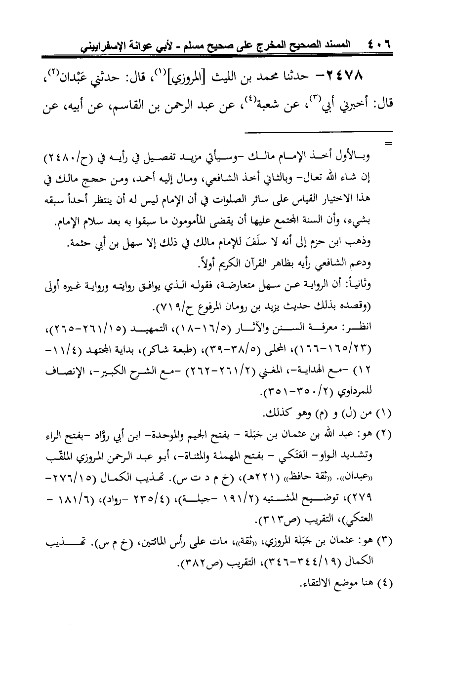 2478 - حدّثنا محمّد بن اللَّيث [المروزي] (¬1)، قال: حدثني عَبْدان (¬2)، قال: أخبرني أبي (¬3)، عن شعبة (¬4)، عن عبد الرّحمن بن القاسم، عن أبيه، عن