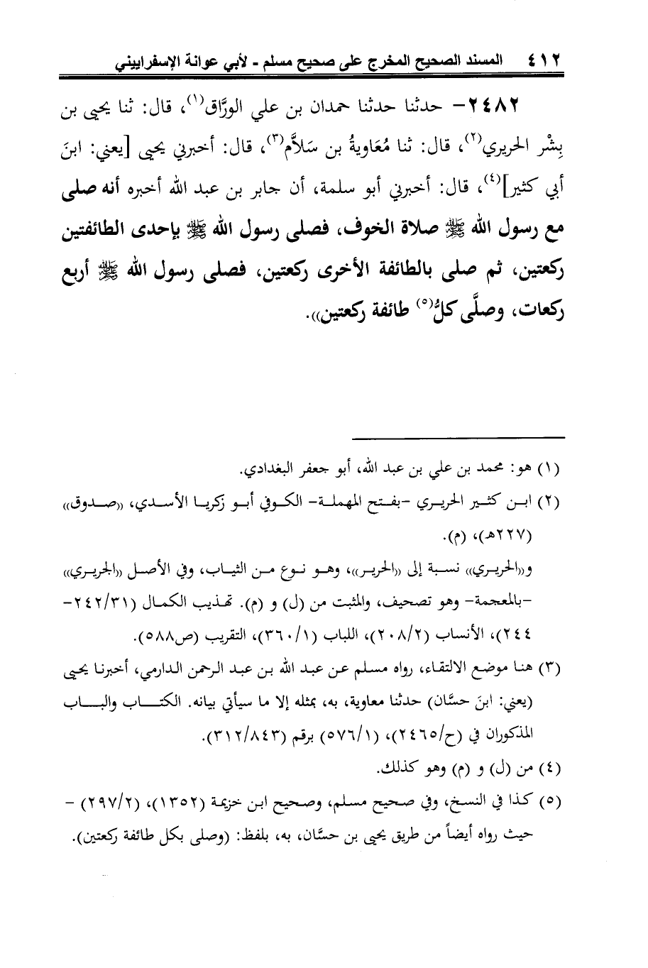 2482 - حدّثنا حدّثنا حمدان بن علي الورَّاق (¬1)، قال: ثنا يحيى بن بِشْر الحريري (¬2)، قال: ثنا مُعَاويةُ بن سَلَّام (¬3)، قال: أخبرني يحيى [يعني: ابنَ أبي كثير] (¬4)، قال: أخبرني أبو سلمة، أن جابر بن عبد الله أخبره أنه صلّى مع رسول الله -صلى الله عليه وسلم- صلاة الخوف، فصلّى رسول الله -صلى الله عليه وسلم- بإحدى الطائفتين ركعتين، ثمّ صلّى بالطائفة الأخرى ركعتين، فصلّى رسول الله -صلى الله عليه وسلم- أربع ركعات، وصلَّى كلُّ (¬5) طائفة ركعتين".