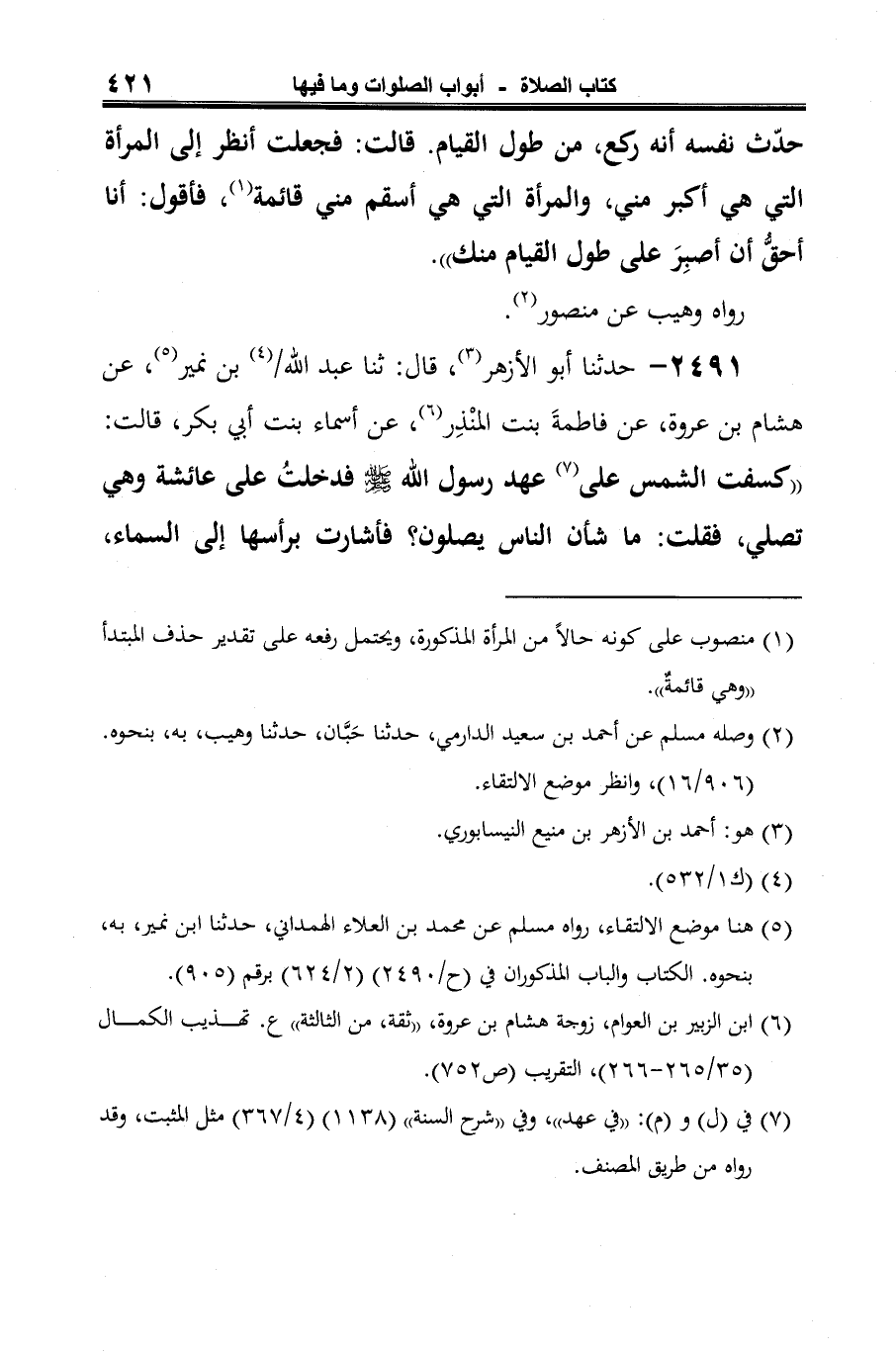 2491 - حدّثنا أبو الأزهر (¬1)، قال: ثنا عبد الله (¬2) بن نمير (¬3)، عن هشام بن عروة، عن فاطمةَ بنت المنْذِر (¬4)، عن أسماء بنت أبي بكر، قالت: "كسفت الشّمس على (¬5) عهد رسول الله -صلى الله عليه وسلم- فدخلتُ على عائشة وهي تصلّي، فقلت: ما شأن النَّاس يصلون؟ فأشارت برأسها إلى السَّماء،