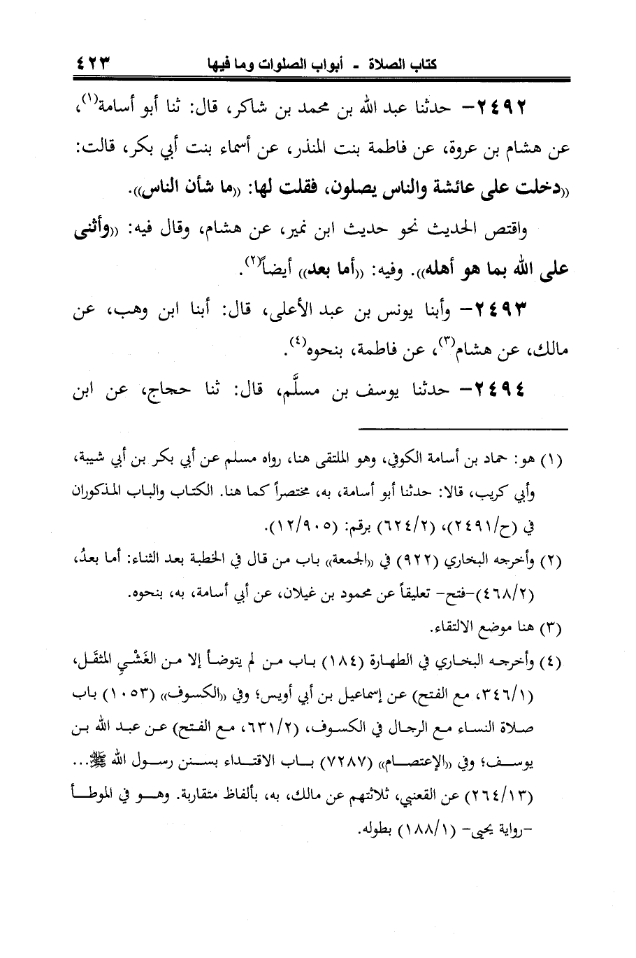2493 - وأبنا يونس بن عبد الأعلى، قال: أبنا ابن وهب، عن مالك، عن هشام (¬1)، عن فاطمة، بنحوه (¬2).