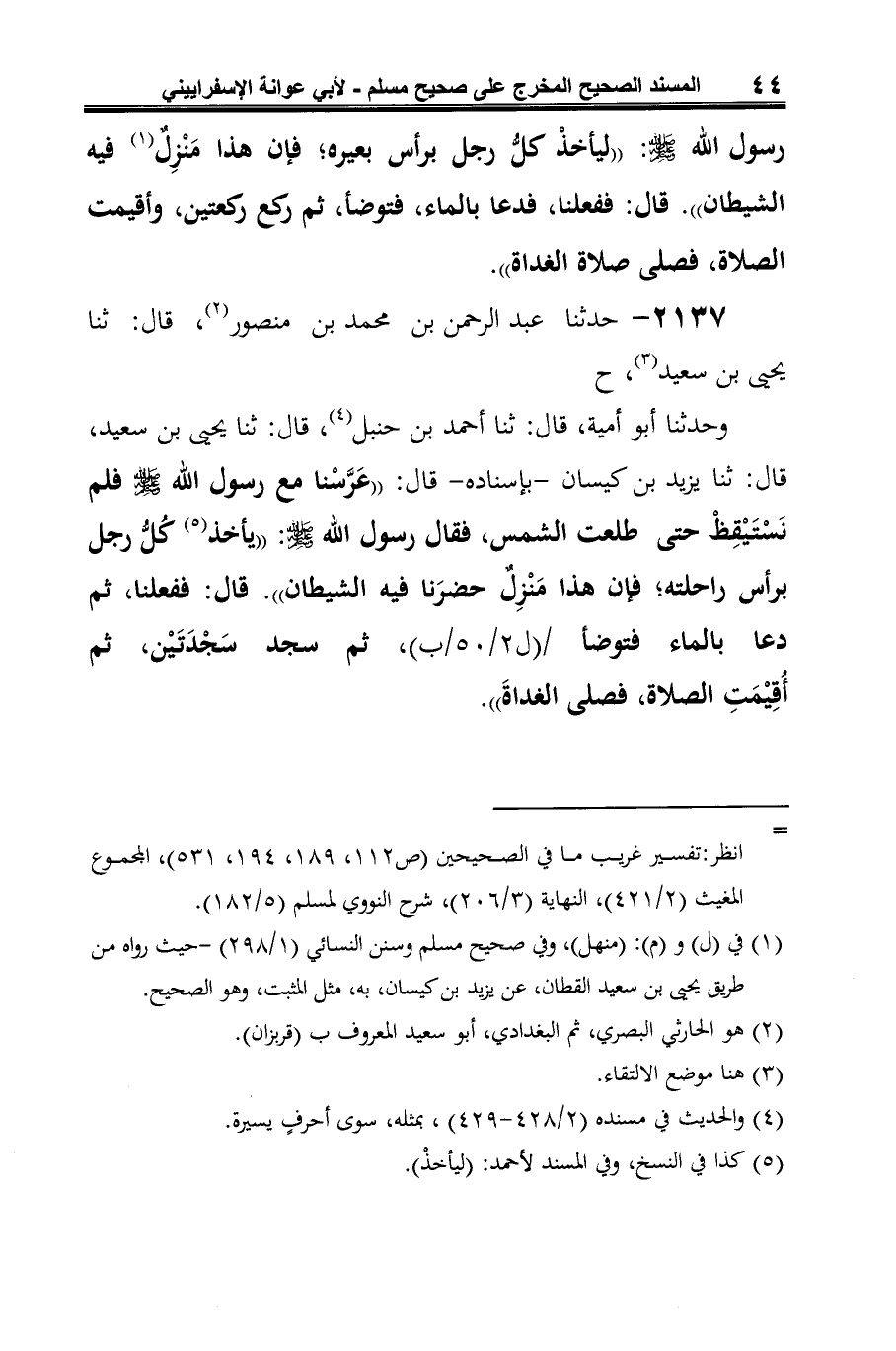 وحدثنا أبو أمية، قال: ثنا أحمد بن حنبل (¬3)، قال: ثنا يحيى بن سعيد، قال: ثنا يزيد بن كيسان -بإسناده- قال: "عَرَّسْنا مع رسول الله -صلى الله عليه وسلم- فلم نَسْتَيْقِظْ حتى طلعت الشمس، فقال رسول الله -صلى الله عليه وسلم-: "يأخذ (¬4) كُلُّ رجل برأس راحلته؛ فإن هذا مَنْزِلٌ حضرَنا فيه الشيطان". قال: ففعلنا، ثم دعا بالماء فتوضأ، ثم سجد سَجْدَتَيْن، ثم أُقِيْمَتِ الصلاة، فصلى الغداةَ".