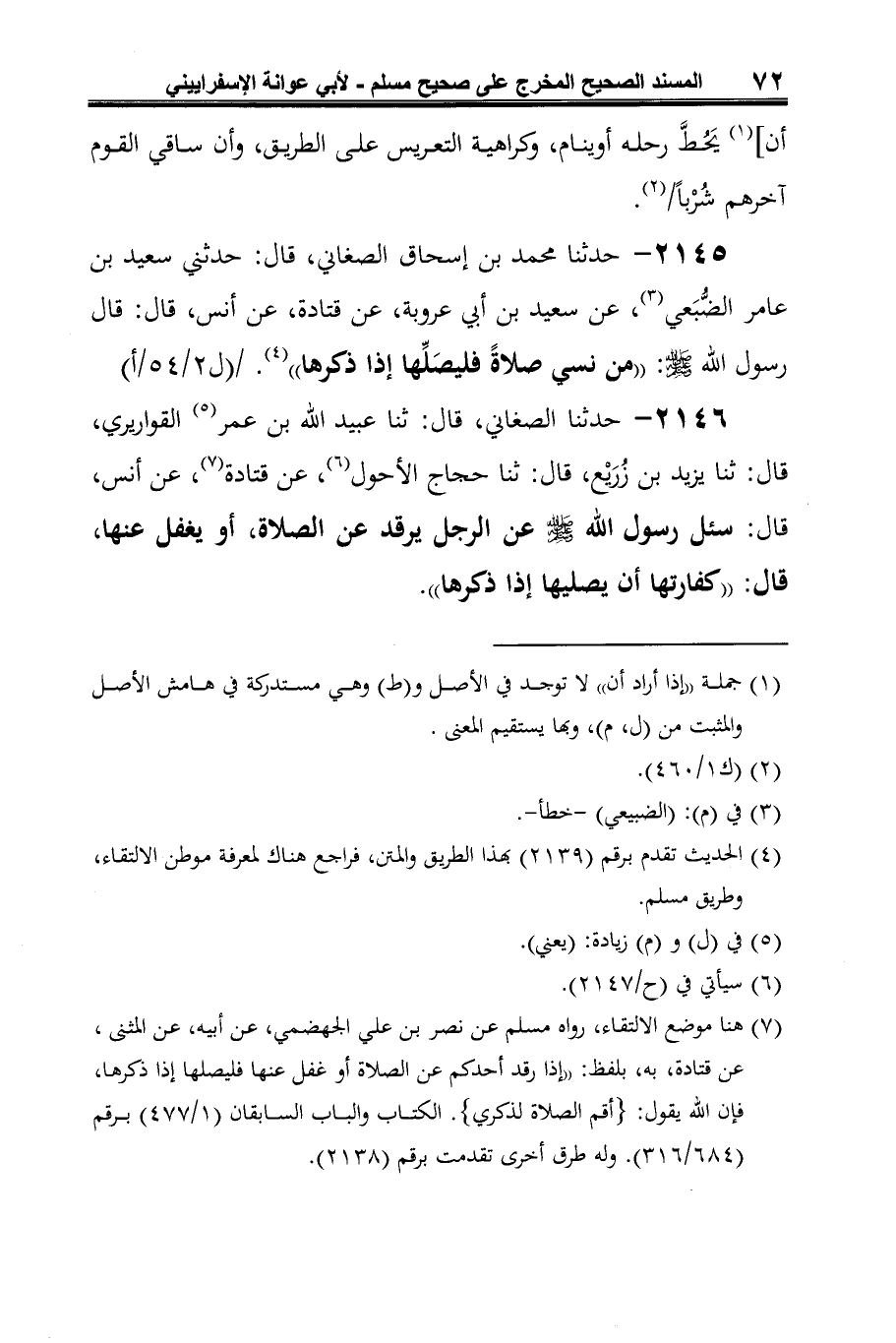 2146 - حدثنا الصغاني، قال: ثنا عبيد الله بن عمر (¬1) القواريري، قال: ثنا يزيد بن زُرَيْع، قال: ثنا حجاج الأحول (¬2)، عن قتادة (¬3)، عن أنس، قال: سئل رسول الله -صلى الله عليه وسلم- عن الرجل يرقد عن الصلاة، أو يغفل عنها، قال: "كفارتها أن يصليها إذا ذكرها".