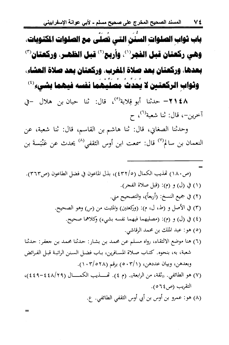(¬2) هنا موضع الالتقاء، رواه مسلم عن محمد بن بشار: حدثنا محمد بن جعفر: حدثنا شعبة، به، بنحوه. كتاب صلاة المسافرين، باب فضل السنن الراتبة قبل الفرائض وبعدهن، وبيان عددهن، (1/ 503) برقم (528/ 103).