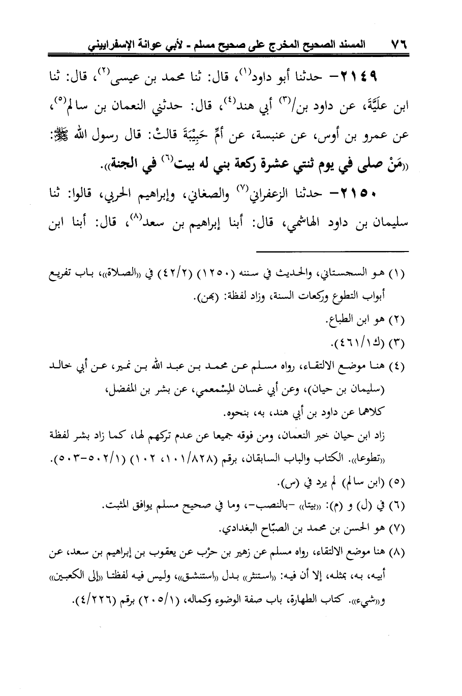 2149 - حدثنا أبو داود (¬1)، قال: ثنا محمد بن عيسى (¬2)، قال: ثنا ابن علَيَّةَ، عن داود بن (¬3) أبي هند (¬4)، قال: حدثني النعمان بن سالم (¬5)، عن عمرو بن أوس، عن عنبسة، عن أمِّ حَبِيْبَةَ قالتْ: قال رسول الله -صلى الله عليه وسلم-: "مَنْ صلى في يوم ثنتي عشرة ركعة بني له بيت (¬6) في الجنة".