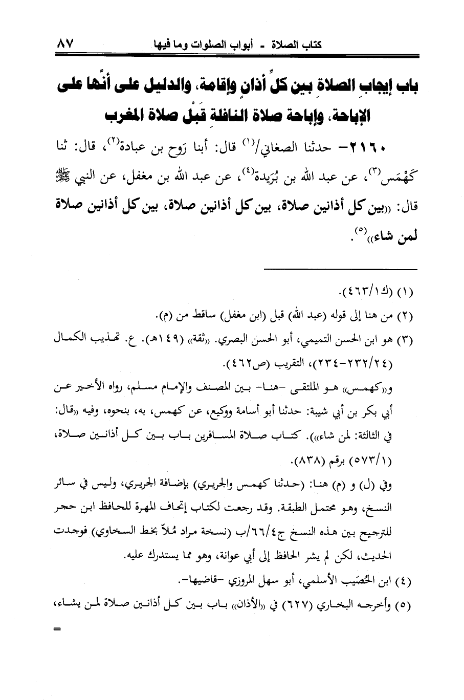 2160 - حدثنا الصغاني (¬1) قال: أبنا رَوح بن عبادة (¬2)، قال: ثنا كَهْمَس (¬3)، عن عبد الله بن بُرَيدة (¬4)، عن عبد الله بن مغفل، عن النبي -صلى الله عليه وسلم- قال: "بين كل أذانين صلاة، بين كل أذانين صلاة، بين كل أذانين صلاة لمن شاء" (¬5).