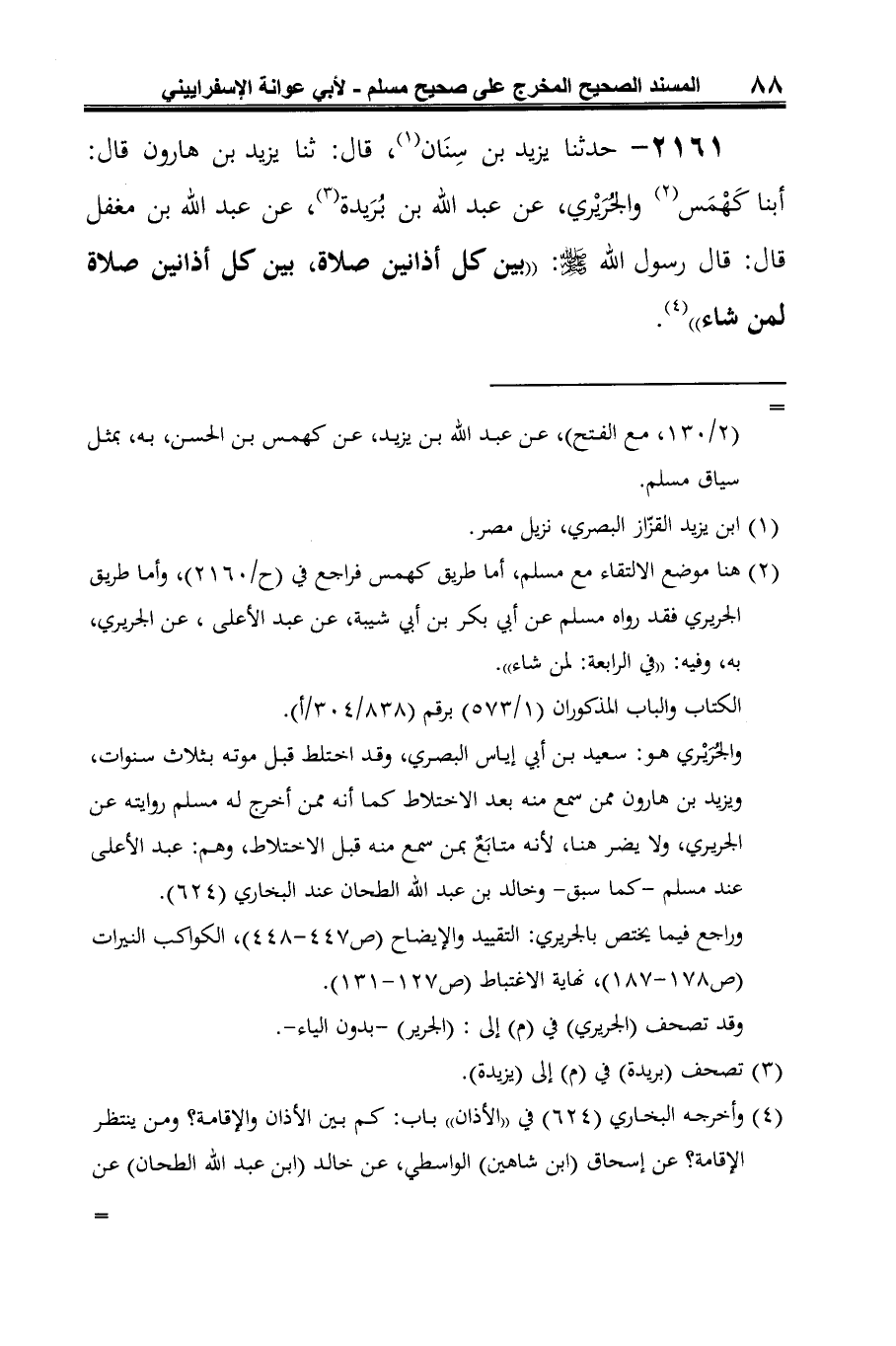 2161 - حدثنا يزيد بن سِنَان (¬1)، قال: ثنا يزيد بن هارون قال: أبنا كَهْمَس (¬2) والجُرَيْري، عن عبد الله بن بُرَيدة (¬3)، عن عبد الله بن مغفل قال: قال رسول الله -صلى الله عليه وسلم-: "بين كل أذانين صلاة، بين كل أذانين صلاة لمن شاء" (¬4).