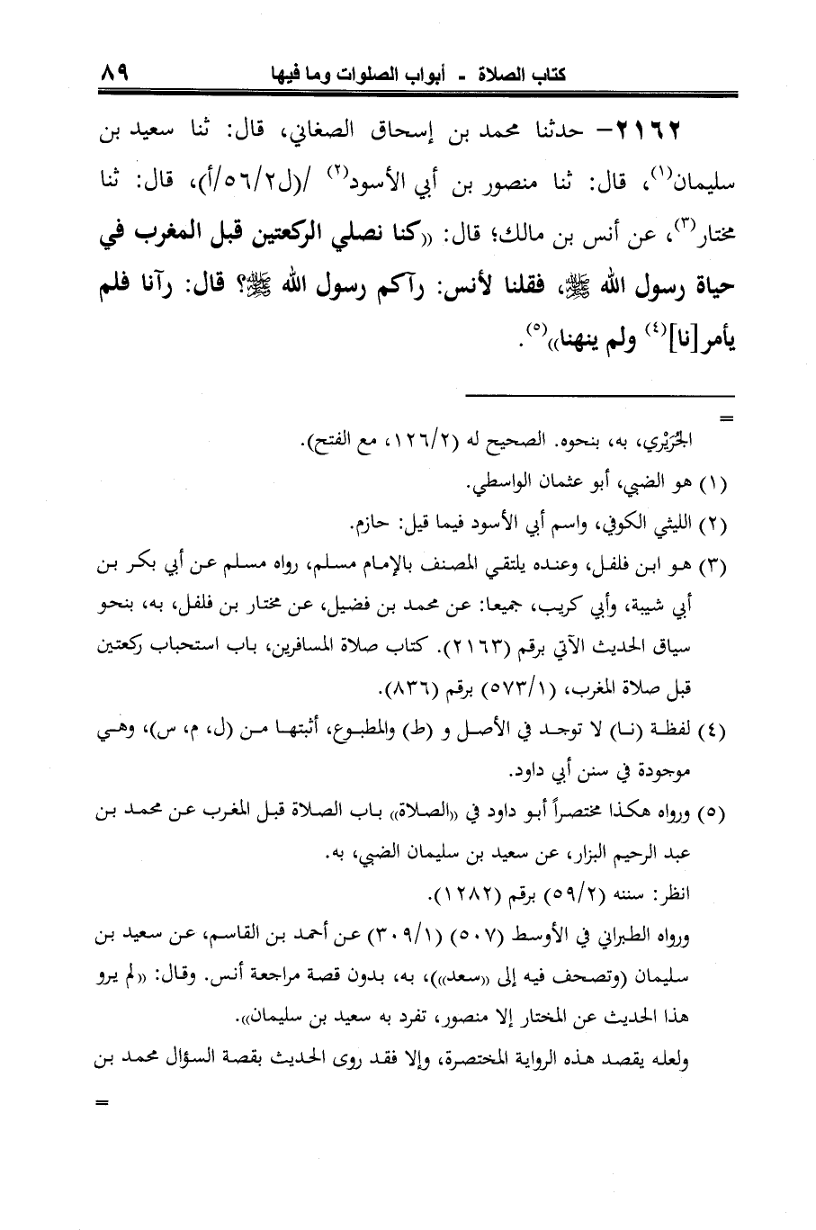 2162 - حدثنا محمد بن إسحاق الصغاني، قال: ثنا سعيد بن سليمان (¬1)، قال: ثنا منصور بن أبي الأسود (¬2)، قال: ثنا مختار (¬3)، عن أنس بن مالك؛ قال: "كنا نصلي الركعتين قبل المغرب في حياة رسول الله -صلى الله عليه وسلم-، فقلنا لأنس: رآكم رسول الله -صلى الله عليه وسلم-؟ قال: رآنا فلم يأمر [نا] (¬4) ولم ينهنا" (¬5).