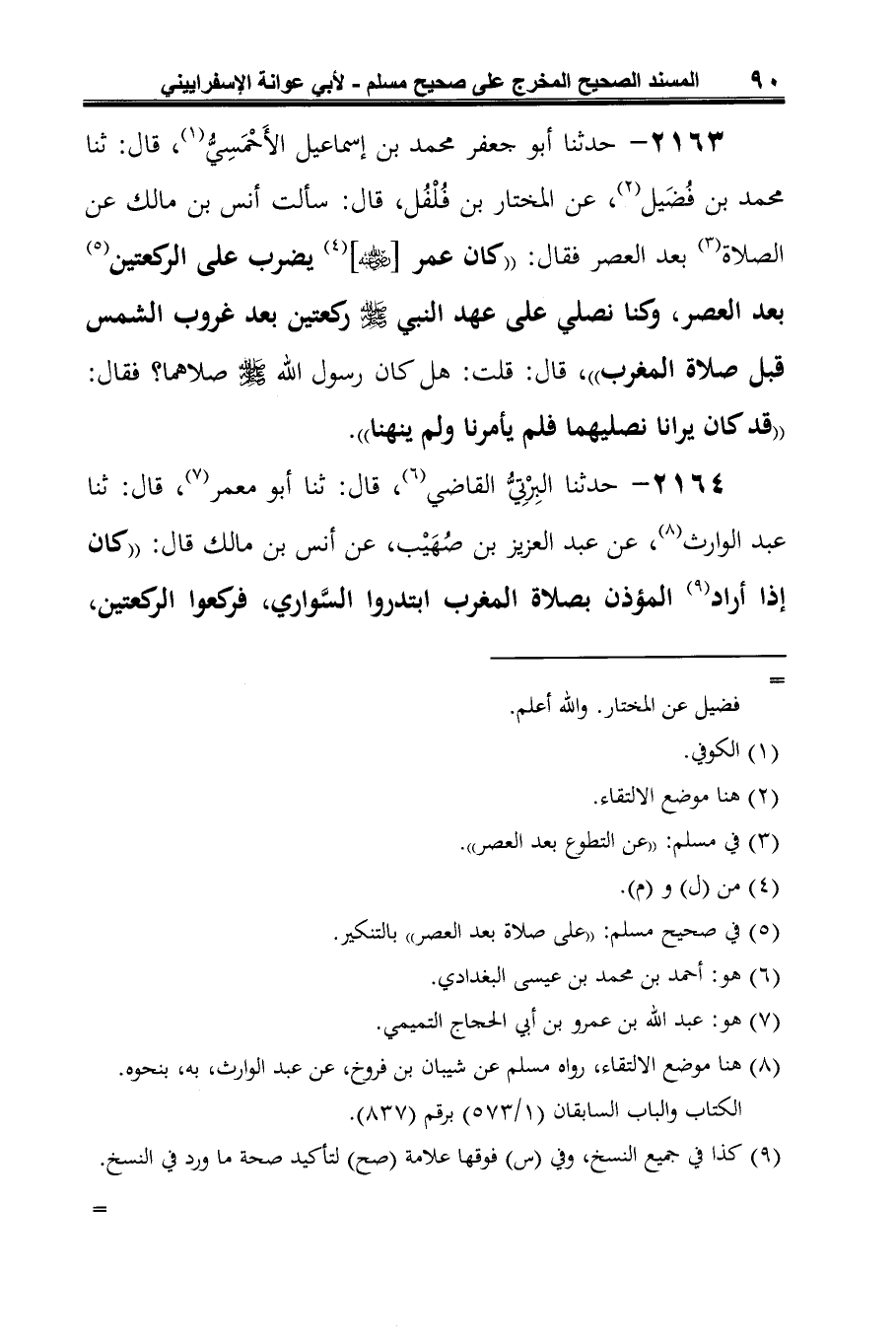 2163 - حدثنا أبو جعفر محمد بن إسماعيل الأَحْمَسِيُّ (¬1)، قال: ثنا محمد بن فُضَيل (¬2)، عن المختار بن فُلْفُل، قال: سألت أنس بن مالك عن الصلاة (¬3) بعد العصر فقال: "كان عمر [-رضي الله عنه-] (¬4) يضرب على الركعتين (¬5) بعد العصر، وكنا نصلي على عهد النبي -صلى الله عليه وسلم- ركعتين بعد غروب الشمس قبل صلاة المغرب"، قال: قلت: هل كان رسول الله -صلى الله عليه وسلم- صلاهما؟ فقال: "قد كان يرانا نصليهما فلم يأمرنا ولم ينهنا".