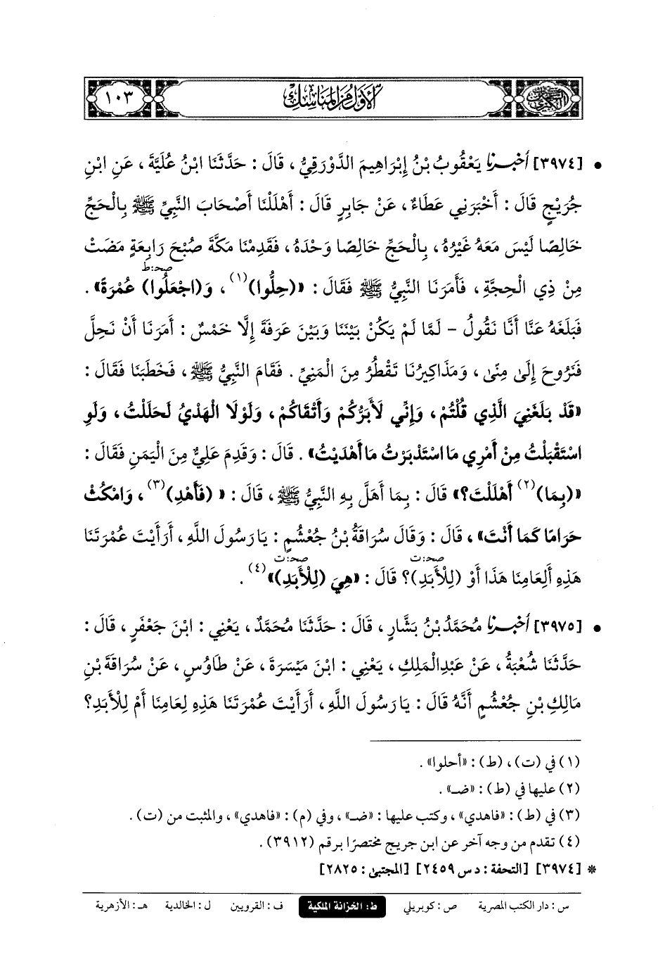 3974- أَخبَرنا يَعقُوبُ بنُ إِبرَاهِيمَ الدَّوْرَقِيُّ، قَالَ: حَدَّثنا ابْنُ عُلَيَّةَ، عَنِ ابنِ جُرَيْجٍ، قَالَ: أَخبَرني عَطَاءٌ، عَن جَابِرٍ، قَالَ: أَهْلَلْنَا أَصْحَابَ النَّبيِّ صَلى الله عَليه وسَلم بِالحَجِّ خَالِصًا لَيْسَ مَعَهُ غَيْرُهُ، بِالحَجِّ خَالِصًا وَحْدَهُ، فَقَدِمْنَا مَكَّةَ صُبْحَ رَابِعَةٍ مَضَتْ مِنْ ذِي الحِجَّةِ، فَأَمَرَنَا النَّبيُّ صَلى الله عَليه وسَلم فَقَالَ: حِلُّوا وَاجْعَلُوا عُمْرَةً، فَبَلَغَهُ عَنَّا أَنَا نَقُولُ: لَمَّا لَمْ يَكُنْ بَيْنَنَا وَبَيْنَ عَرَفَةَ إِلاَّ خَمْسٌ أَمَرَنَا أَنْ نَحِلَّ فَنَرُوحَ إِلَى مِنًى وَمَذَاكِيرُنَا تَقْطُرُ مِنَ المَنِيِّ، فَقَامَ النَّبيُّ صَلى الله عَليه وسَلم فَخَطَبَنَا، فَقَالَ: قَدْ بَلَغَنِي الَّذِي قُلْتُمْ، وَإِنِّي لأَبَرُّكُمْ وَأَتْقَاكُمْ، وَلَوْلا الهَدْيُ لَحَلَلْتُ، وَلَوِ اسْتَقْبَلْتُ مِنْ أَمْرِي مَا اسْتَدْبَرْتُ مَا أَهْدَيْتُ، قَالَ: وَقَدِمَ عَليٌّ مِنَ اليَمَنِ، فَقَالَ: بِمَ أَهْلَلْتَ؟ قَالَ: بِمَا أَهَلَّ بِهِ النَّبيُّ صَلى الله عَليه وسَلم، قَالَ: فَأَهْدِ وَامْكُثْ حَرَامًا كَمَا أَنْتَ، قَالَ: وَقَالَ سُرَاقَةُ بنُ جُعْشُمٍ: يَا رَسُولَ اللهِ، أَرَأَيْتَ عُمْرَتَنَا هَذِهِ، أَلِعَامِنَا هَذَا أَوْ لِلأَبَدِ؟ قَالَ: هِيَ لِلأَبَدِ.