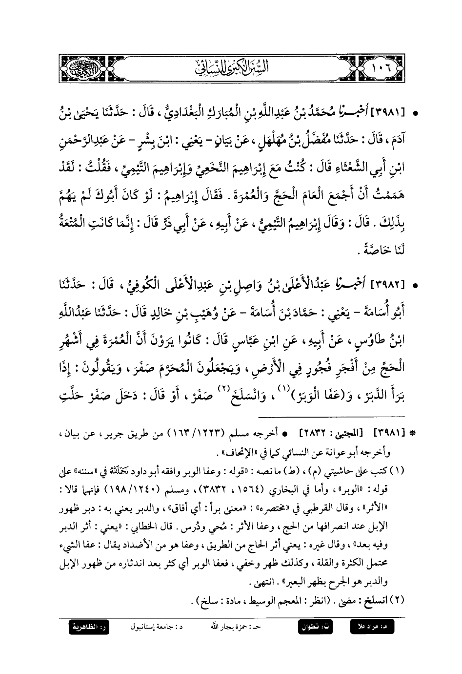 3981- أَخبَرنا مُحَمدُ بنُ عَبدِ اللهِ بنِ المُبَارَكِ البَغْدَادِيُّ، قَالَ: حَدَّثنا يَحيَى بنُ آدَمَ، قَالَ: حَدَّثنا مُفَضَّلُ بنُ مُهَلْهَلٍ، عَن بَيَانٍ، يَعْنِي ابْنَ بِشْرٍ، عَن عَبدِ الرَّحمَنِ بنِ أَبي الشَّعْثَاءِ، قَالَ: كُنْتُ مَعَ إِبرَاهِيمَ النَّخَعِيِّ، وَإِبرَاهِيمَ التَّيْمِيِّ، فَقُلْتُ: لَقَدْ هَمَمْتُ أَنْ أَجْمَعَ العَامَ الحَجَّ وَالعُمْرَةَ، فَقَالَ إِبرَاهِيمُ: لَوْ كَانَ أَبوكَ لَمْ يَهُمَّ بِذَلِكَ، قَالَ، وَقَالَ إِبرَاهِيمُ التَّيْمِيُّ: عَن أَبيهِ، عَن أَبي ذَرٍّ قَالَ: إِنَّمَا كَانَتِ المُتْعَةُ لَنَا خَاصَّةً.
