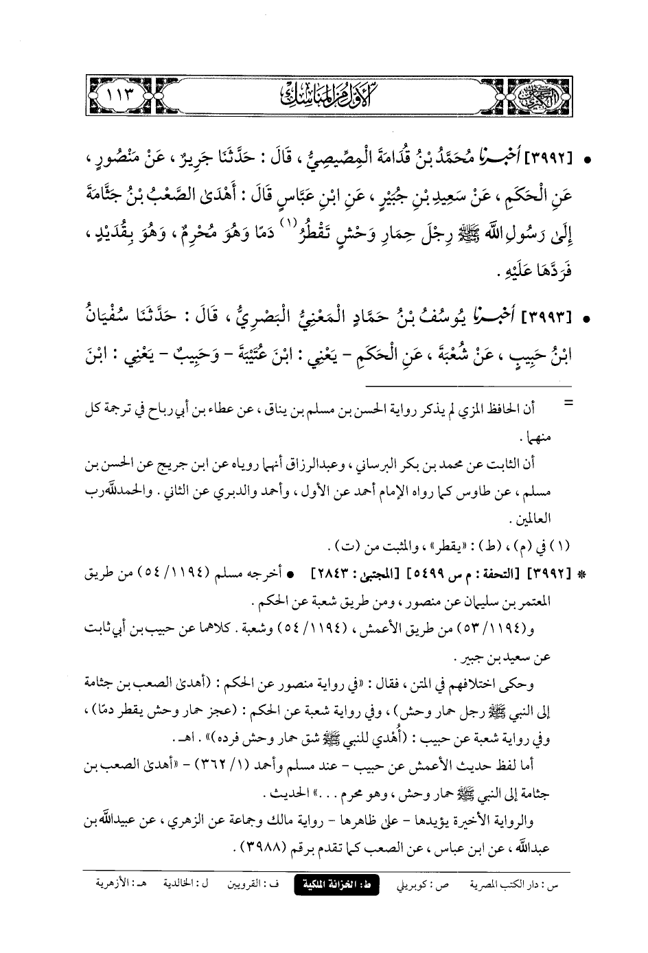 3992- أَخبَرنا مُحَمدُ بنُ قُدَامَةَ المِصِّيصِيُّ، قَالَ: حَدَّثنا جَرِيرٌ، عَن مَنْصُورٍ، عَنِ الحَكَمِ، عَن سَعِيدِ بنِ جُبَيرٍ، عَنِ ابنِ عَبَّاسٍ، قَالَ: أَهْدَى الصَّعْبُ بنُ جَثَّامَةَ إِلَى رَسُولِ اللهِ صَلى الله عَليه وسَلم رِجْلَ حِمَارِ وَحْشٍ تَقْطُرُ دَمًا، وَهُوَ مُحْرِمٌ، وَهُوَ بِقُدَيْدٍ، فَرَدَّهَا عَلَيْهِ.