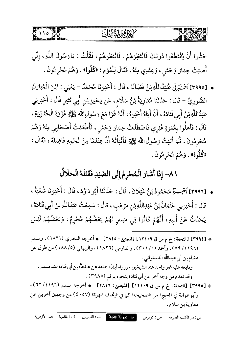 3995- أَخبَرني عُبَيدُ اللهِ بنُ فَضَالَةَ، قَالَ: أَخبَرنا مُحَمدٌ، يَعْنِي ابْنَ المُبَارَكِ الصُّورِيَّ، قَالَ: حَدَّثنا مُعاويَةُ بْنَ سَلاَّمٍ، عَن يَحيَى بنِ أَبي كَثِيرٍ، قَالَ: أَخبَرني عَبدُ اللهِ بنُ أَبي قَتَادَةَ، أَنَّ أَبَاهُ أَخبَرَهُ، أَنَّهُ غَزَا مَعَ رَسُولِ اللهِ صَلى الله عَليه وسَلم غَزْوَةَ الحُدَيْبِيَةِ، قَالَ: فَأَهَلُّوا بِعُمْرَةٍ غَيْرِي، فَاصْطَدْتُ حِمَارَ وَحْشٍ، فَأَطْعَمْتُ أَصْحَابِي مِنْهُ وَهُمْ مُحْرِمُونَ، ثُمَّ أَتَيْتُ رَسُولَ اللهِ صَلى الله عَليه وسَلم فَأَنْبَأْتُهُ أَنَّ عِنْدَنَا مِنْ لَحْمِهِ فَاضِلَةً، فَقَالَ: كُلُوهُ وَهُمْ مُحْرِمُونَ.
