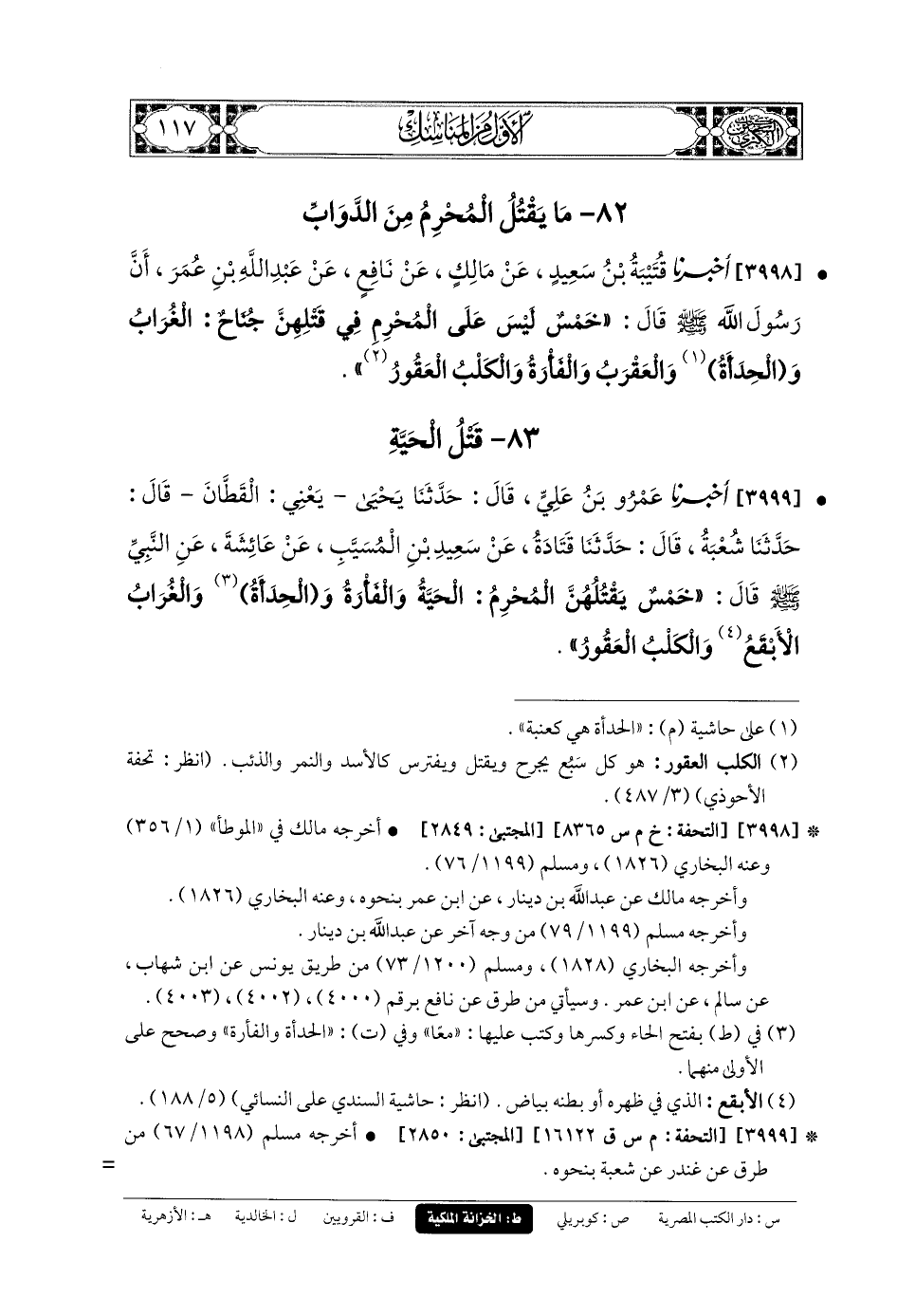 3998- أَخبَرنا قُتَيبَةُ بنُ سَعِيدٍ، عَن مَالِكٍ، عَن نَافِعٍ، عَنِ عَبدِ اللهِ بنِ عُمَرَ، أَنَّ رَسُولَ اللهِ صَلى الله عَليه وسَلم قَالَ: خَمْسٌ لَيْسَ عَلَى المُحْرِمِ فِي قَتْلِهِنَّ جُنَاحٌ: الغُرَابُ، وَالحِدَأَةُ، وَالعَقْرَبُ، وَالفَأْرَةُ، وَالكَلْبُ العَقُورُ.