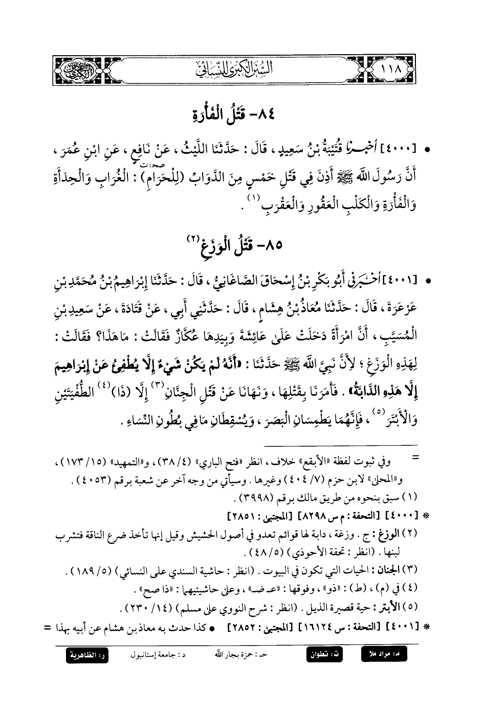 4000- أَخبَرنا قُتَيبَةُ بنُ سَعِيدٍ، قَالَ: حَدَّثنا اللَّيْثُ، عَن نَافِعٍ، عَنِ ابنِ عُمَرَ، أَنَّ رَسُولَ اللهِ صَلى الله عَليه وسَلم أَذِنَ فِي قَتْلِ خَمْسٍ مِنَ الدَّوَابِّ لِلْحَرَامِ: الغُرَابُ، وَالحِدَأَةُ، وَالفَأْرَةُ، وَالكَلْبُ العَقُورُ، وَالعَقْرَبُ.