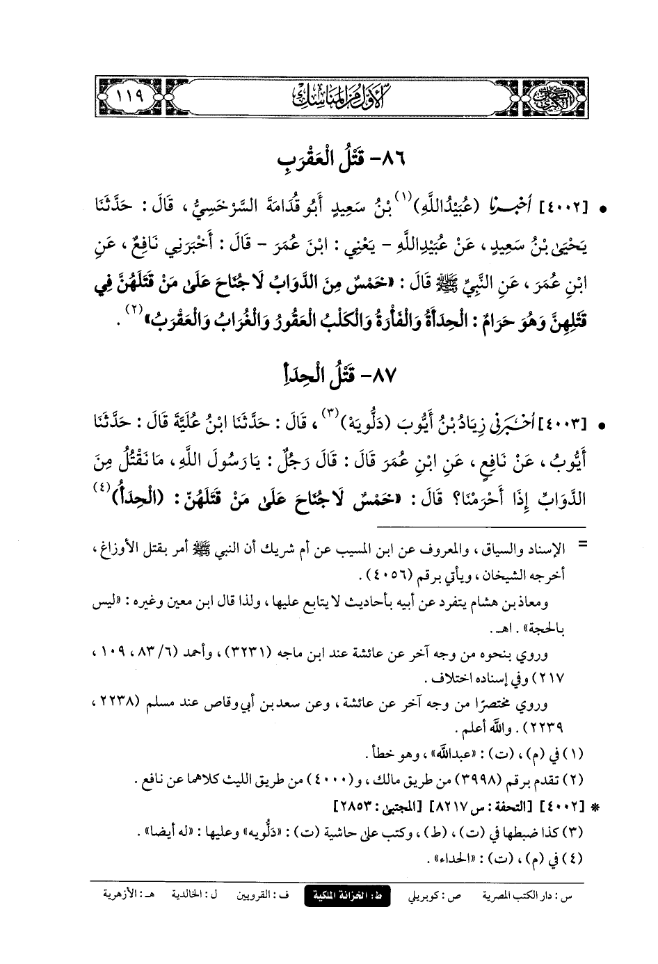 4003- أَخبَرني زِيَادُ بنُ أَيوبَ، دَلُّوَيْهِ، قَالَ: حَدَّثنا ابْنُ عُلَيَّةَ، قَالَ: حَدَّثنا أَيوبُ، عَن نَافِعٍ، عَنِ ابنِ عُمَرَ، قَالَ: قَالَ رَجُلٌ: يَا رَسُولَ اللهِ، مَا نَقْتُلُ مِنَ الدَّوَابِّ إِذَا أَحْرَمْنَا؟ قَالَ: خَمْسٌ لا جُنَاحَ عَلَى مَنْ قَتَلَهُنَّ: الحِدءُ، وَالغُرَابُ، وَالفَأْرَةُ، وَالعَقْرَبُ، وَالكَلْبُ العَقُورُ.