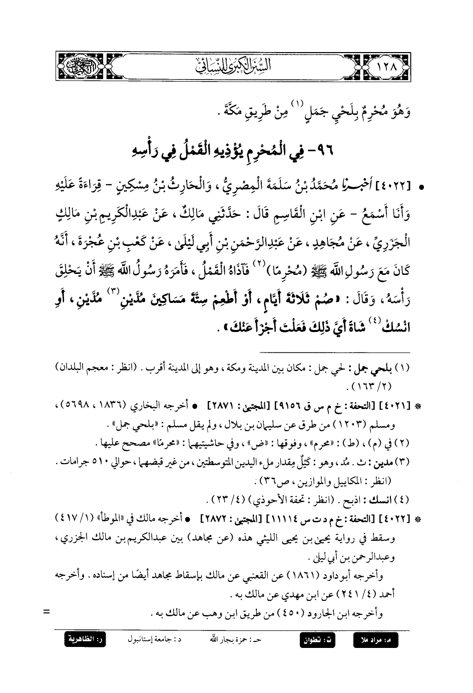 4022- أَخبَرنا مُحَمدُ بنُ سَلَمَةَ المِصْرِيُّ، وَالحَارِثُ بنُ مِسْكِينٍ، قِرَاءَةً عَلَيْهِ، وَأَنَا أَسْمَعُ، عَنِ ابنِ القَاسِمِ، قَالَ: حَدَّثني مَالِكٌ، عَن عَبدِ الكَرِيمِ بنِ مَالِكٍ الجَزَرِيِّ، عَن مُجَاهِدٍ، عَن عَبدِ الرَّحمَنِ بنِ أَبي لَيْلَى، عَن كَعْبِ بنِ عُجْرَةَ، أَنَّهُ كَانَ مَعَ رَسُولِ اللهِ صَلى الله عَليه وسَلم مُحْرِمًا، فَآذَاهُ القَمْلُ، فَأَمَرَهُ رَسُولُ اللهِ صَلى الله عَليه وسَلم أَنْ يَحْلِقَ رَأْسَهُ، وَقَالَ: صُمْ ثَلاثَةَ أَيَّامٍ، أَوْ أَطْعِمْ سِتَّةَ مَسَاكِينَ مُدَّيْنِ مُدَّيْنِ، أَوِ انْسُكْ شَاةً، أَيَّ ذَلِكَ فَعَلْتَ أَجْزَأَ عَنكَ.