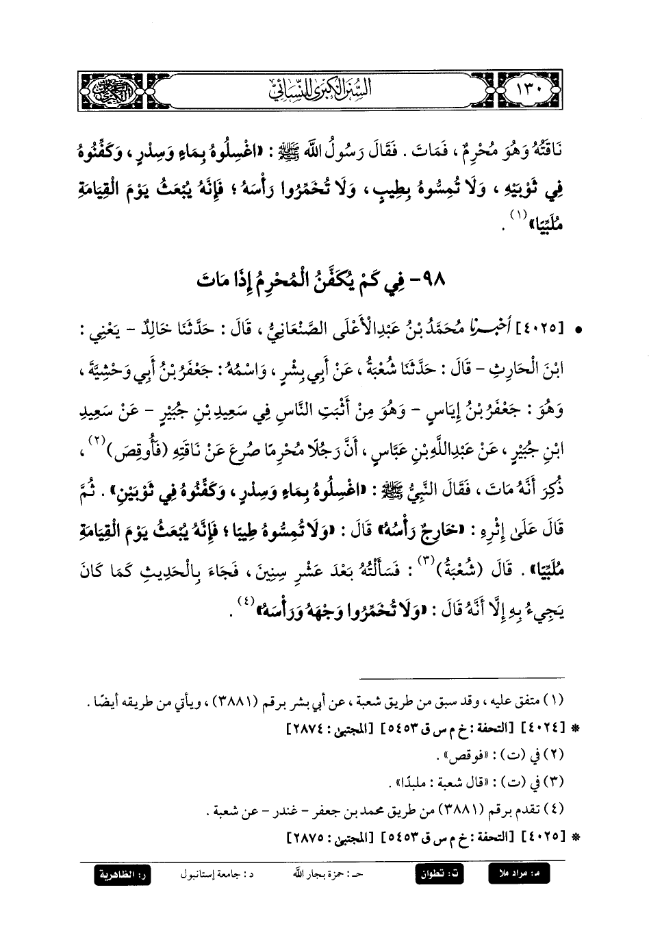4025- أَخبَرنا مُحَمدُ بنُ عَبدِ الأَعْلَى الصَّنْعَانِيُّ، قَالَ: حَدَّثنا خَالِدٌ، يَعْنِي ابْنَ الحَارِثِ، قَالَ: حَدَّثنا شُعْبَةُ، عَن أَبي بِشْرٍ، وَاسْمُهُ: جَعفَرُ بنُ أَبي وَحْشِيَّةَ، وَهُوَ جَعفَرُ بنُ إِيَاسٍ، وَهُوَ مِنْ أَثْبَتِ النَّاسِ فِي سَعِيدِ بنِ جُبَيرٍ، عَن سَعِيدِ بنِ جُبَيرٍ، عَنِ عَبدِ اللهِ بنِ عَبَّاسٍ، أَنَّ رَجُلاً مُحْرِمًا صُرِعَ عَن نَاقَتِهِ، فَأُوقِصَ ذُكِرَ أَنَّهُ مَاتَ، فَقَالَ النَّبيُّ صَلى الله عَليه وسَلم: اغْسِلُوهُ بِمَاءٍ وَسِدْرٍ، وَكَفِّنُوهُ فِي ثَوْبَيْنِ، ثُمَّ قَالَ عَلَى إِثْرِهِ: خَارِجٌ رَأْسُهُ، قَالَ: وَلا تُمِسُّوهُ طِيبًا، فَإِنَّهُ يُبْعَثُ يَوْمَ القِيَامَةِ مُلَبِّيًا.