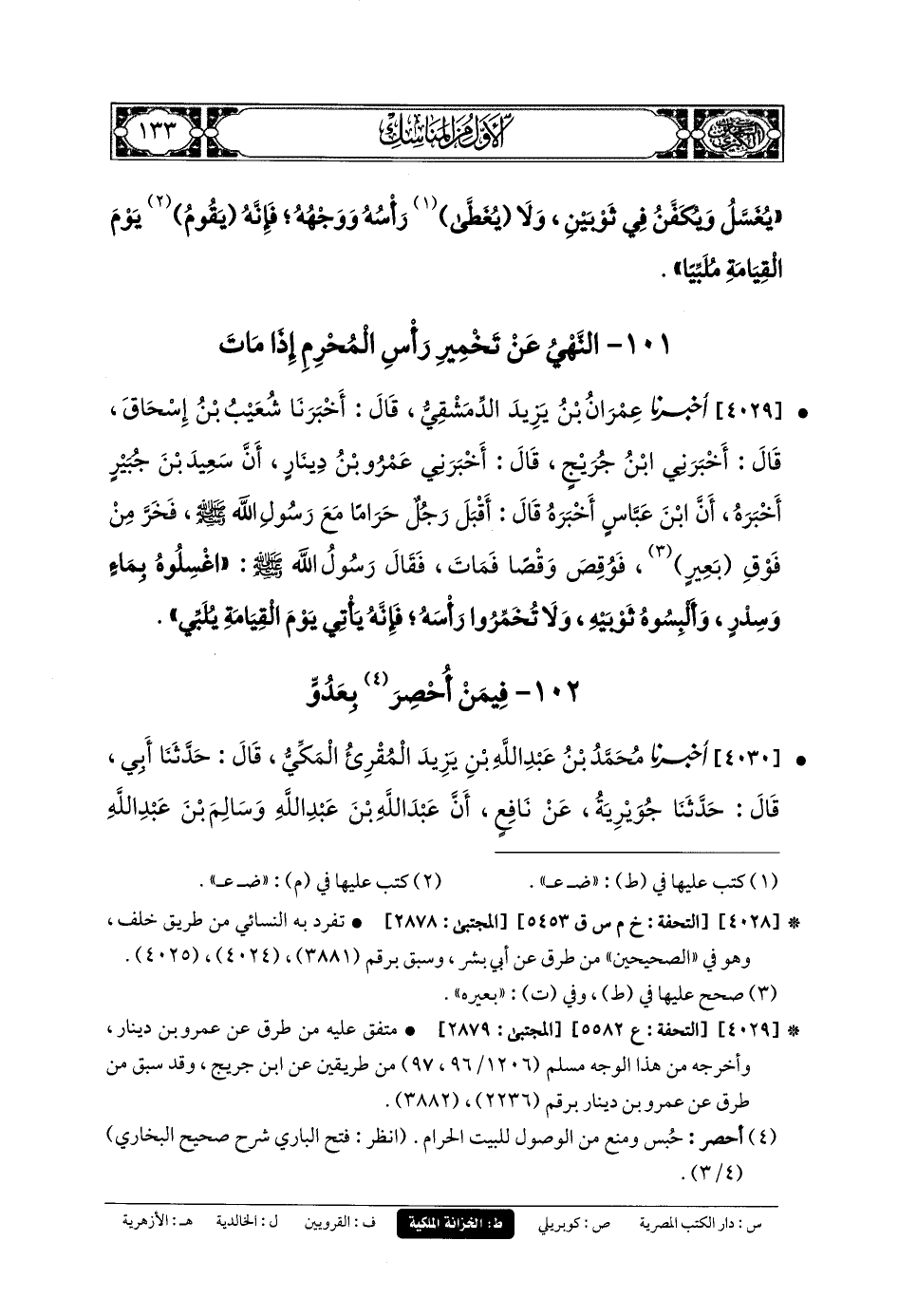 101- النَّهْيُ عَن تَخْمِيرِ رَأْسِ المُحْرِمِ إِذَا مَاتَ.