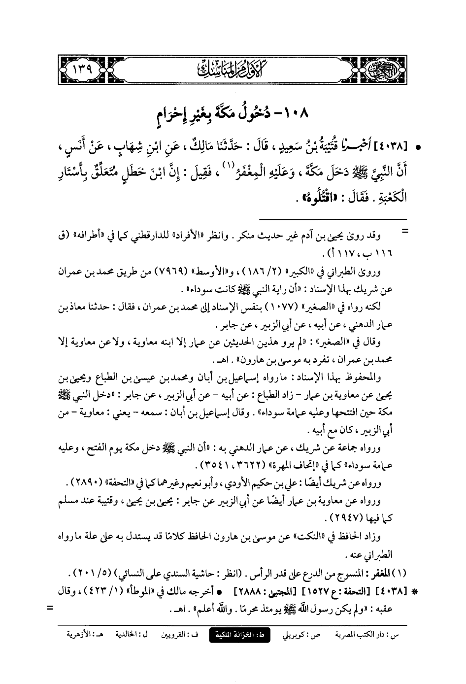4038- أَخبَرنا قُتَيبَةُ بنُ سَعِيدٍ، قَالَ: حَدَّثنا مَالِكٌ، عَنِ ابنِ شِهَابٍ، عَن أَنَسٍ، أَنَّ النَّبيَّ صَلى الله عَليه وسَلم دَخَلَ مَكَّةَ وَعَلَيْهِ المِغْفَرُ، فَقِيلَ: إِنَّ ابْنَ خَطَلٍ مُتَعَلِّقٌ بِأَسْتَارِ الكَعْبَةِ، فَقَالَ: اقْتُلُوهُ.