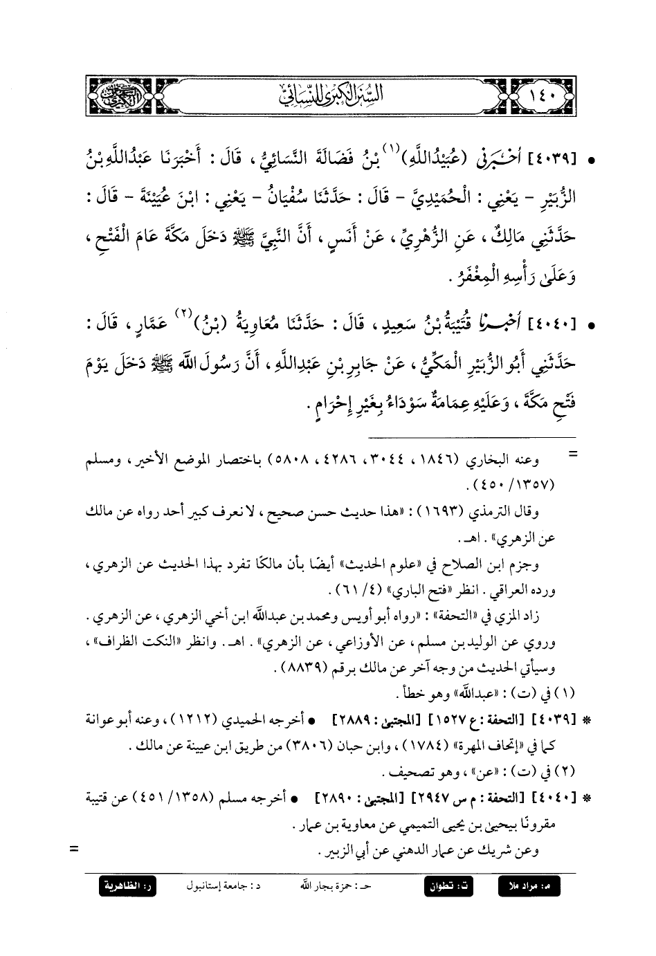 4040- أَخبَرنا قُتَيبَةُ بنُ سَعِيدٍ، قَالَ: حَدَّثنا مُعاويَةُ بنُ عَمَّارٍ، قَالَ: حَدَّثني أَبو الزُّبَيْرِ المَكِّيُّ، عَن جَابِرِ بنِ عَبدِ اللهِ، أَنَّ رَسُولَ اللهِ صَلى الله عَليه وسَلم دَخَلَ يَوْمَ الفَتْحِ مَكَّةَ وَعَلَيْهِ عِمَامَةٌ سَوْدَاءُ بِغَيْرِ إِحْرَامٍ.