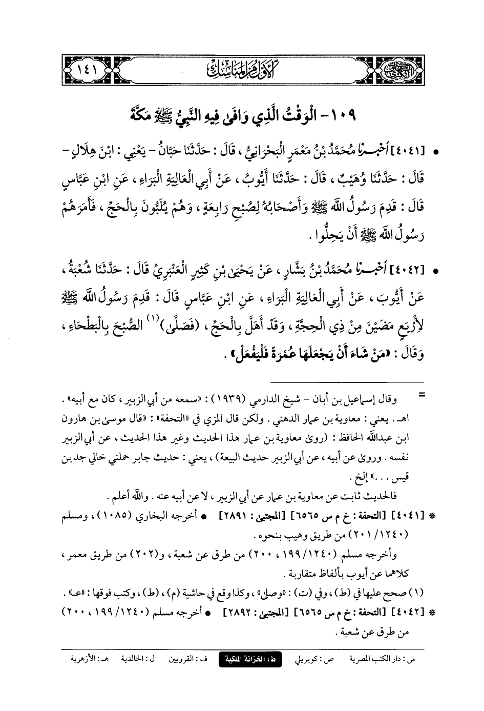 4041- أَخبَرنا مُحَمدُ بنُ مَعْمَرٍ البَحْرَانِيُّ، قَالَ: حَدَّثنا حَبَّانُ، يَعْنِي ابْنَ هِلالٍ، قَالَ: حَدَّثنا وُهَيْبٌ، قَالَ: حَدَّثنا أَيوبُ، عَن أَبي العَالِيَةِ البَرَاءِ، عَنِ ابنِ عَبَّاسٍ، قَالَ: قَدِمَ رَسُولُ اللهِ صَلى الله عَليه وسَلم وَأَصْحَابُهُ لِصُبْحِ رَابِعَةٍ وَهُمْ يُلَبُّونَ بِالحَجِّ، فَأَمَرَهُمْ رَسُولُ اللهِ صَلى الله عَليه وسَلم أَنْ يَحِلُّوا.