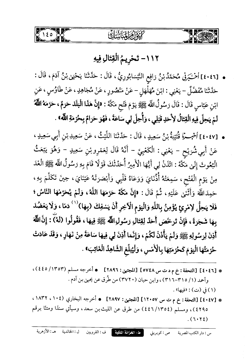 4046- أَخبَرني مُحَمدُ بنُ رَافِعٍ النَّيْسَابُورِيُّ، قَالَ: حَدَّثنا يَحيَى بنُ آدَمَ، قَالَ: حَدَّثنا مُفَضَّلٌ، يَعْنِي ابْنَ مُهَلْهَلٍ، عَن مَنْصُورٍ، عَن مُجَاهِدٍ، عَن طَاوُوسٍ، عَنِ ابنِ عَبَّاسٍ، قَالَ: قَالَ رَسُولُ اللهِ صَلى الله عَليه وسَلم يَوْمَ فَتْحِ مَكَّةَ: إِنَّ هَذَا البَلَدَ حَرَمٌ حَرَّمَهُ اللهُ، لَمْ يَحِلَّ فِيهِ القِتَالُ لأَحَدٍ قَبْلِي، وَأُحِلَّ لِي سَاعَةً، فَهُوَ حَرَامٌ بِحُرْمَةِ اللهِ.