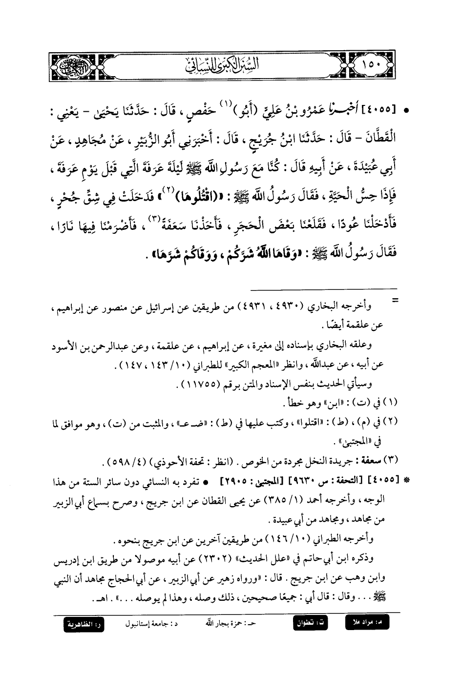 4055- أَخبَرنا عَمرُو بنُ عَليِّ أَبو حَفْصٍ، قَالَ: حَدَّثنا يَحيَى، يَعْنِي القَطَّانَ، قَالَ: حَدَّثنا ابْنُ جُرَيْجٍ، قَالَ: أَخبَرني أَبو الزُّبَيْرِ، عَن مُجَاهِدِ، عَن أَبي عُبَيدَةَ، عَن أَبيهِ، قَالَ: كُنَّا مَعَ رَسُولِ اللهِ صَلى الله عَليه وسَلم لَيْلَةَ عَرَفَةَ الَّتِي قَبْلَ يَوْمِ عَرَفَةَ، فَإِذَا حِسُّ الحَيَّةِ، فَقَالَ رَسُولُ اللهِ صَلى الله عَليه وسَلم: اقْتُلُوهَا، فَدَخَلَتْ فِي شَقِّ جُحْرٍ، فَأَدْخَلْنَا عُودًا، فَقَلَعْنَا بَعْضَ الحجر، فَأَخَذْنَا سَعَفَةً، فَأَضْرَمْنَا فِيهَا نَارًا، فَقَالَ رَسُولُ اللهِ صَلى الله عَليه وسَلم: وَقَاهَا اللهُ شَرَّكُمْ، وَوَقَاكُمْ شَرَّهَا.