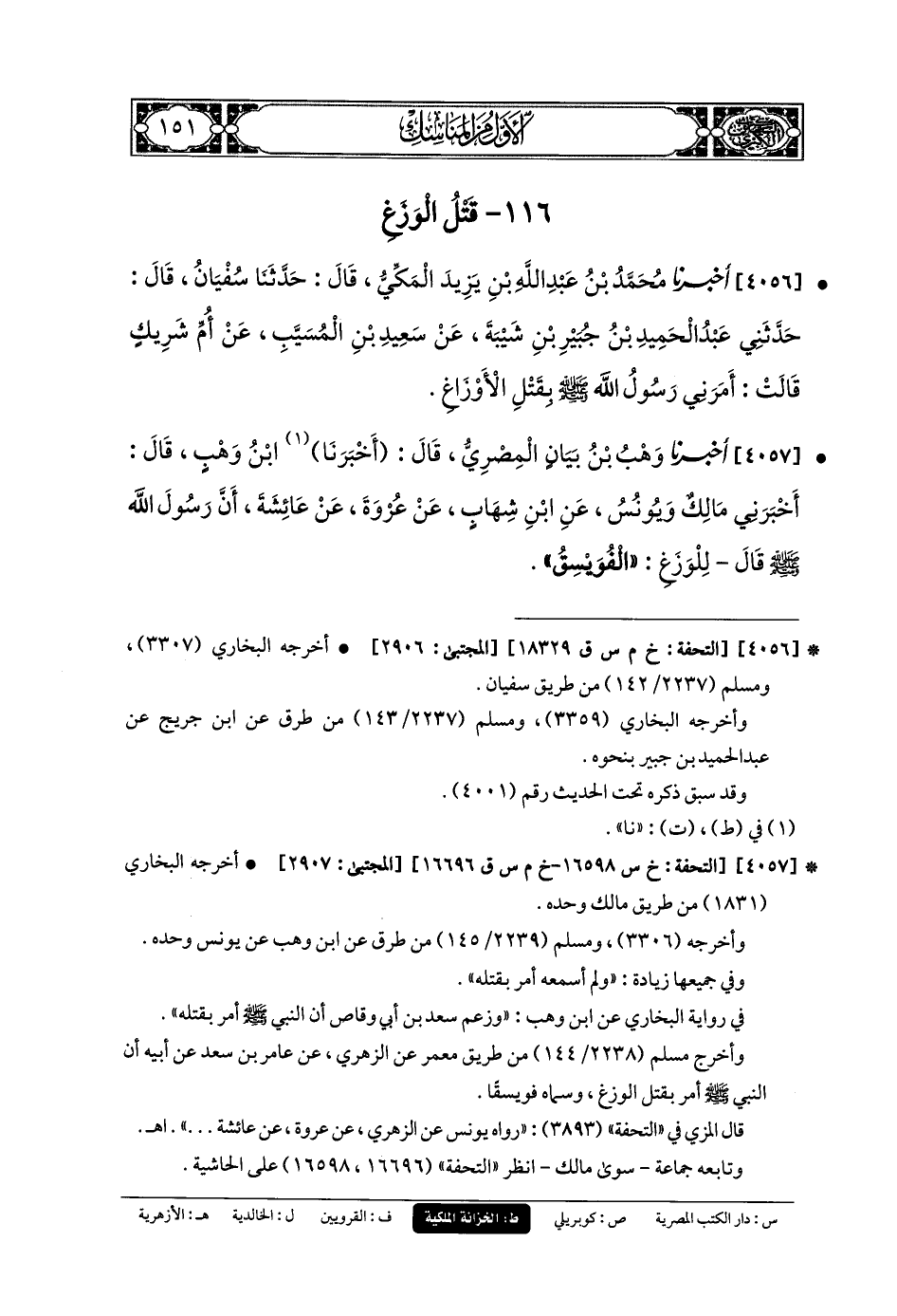 4057- أَخبَرنا وَهْبُ بنُ بَيَانٍ المِصْرِيُّ، قَالَ: أَخبَرنا ابْنُ وَهْبٍ، قَالَ: أَخبَرني مَالِكٌ، وَيُونُسُ، عَنِ ابنِ شِهَابٍ، عَن عُرْوَةَ، عَن عَائِشَةَ، أَنَّ رَسُولَ اللهِ صَلى الله عَليه وسَلم قَالَ لِلْوَزَغِ: الفُوَيْسِقُ.