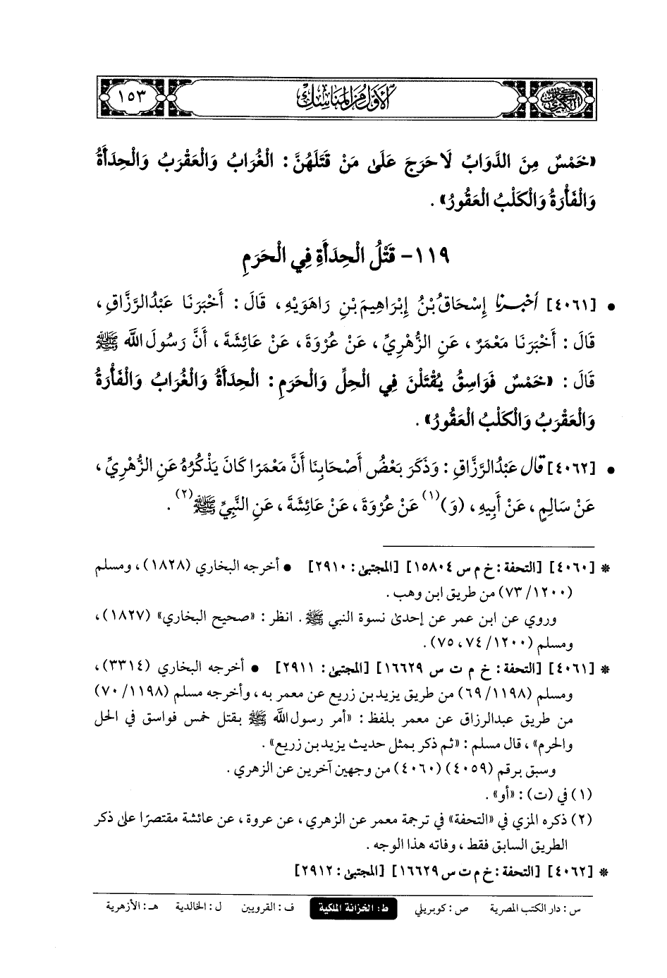 4061- أَخبَرنا إِسحَاقُ بنُ إِبرَاهِيمَ بنِ رَاهَوَيْهِ، قَالَ: أَخبَرنا عَبدُ الرَّزَّاقِ، قَالَ: أَخبَرنا مَعْمَرٌ، عَنِ الزُّهْرِيِّ، عَن عُرْوَةَ، عَن عَائِشَةَ، أَنَّ رَسُولَ اللهِ صَلى الله عَليه وسَلم قَالَ: خَمْسُ فَوَاسِقَ يُقْتَلْنَ فِي الحِلِّ وَالحَرَمِ: الحِدَأَةُ، وَالغُرَابُ، وَالفَأْرَةُ، وَالعَقْرَبُ، وَالكَلْبُ العَقُورُ.