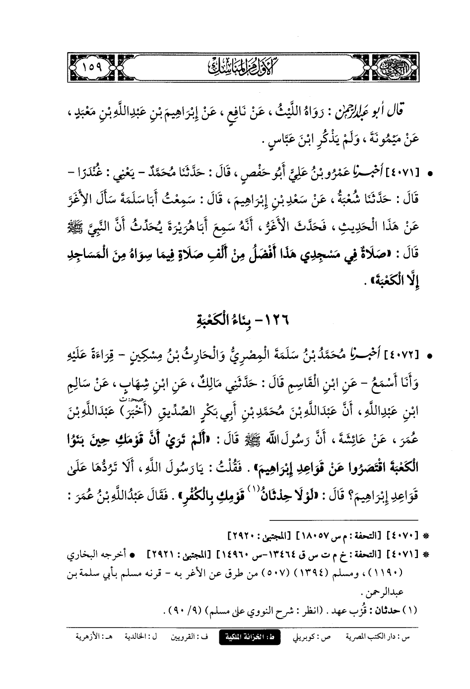 4072- أَخبَرنا مُحَمدُ بنُ سَلَمَةَ المِصْرِيُّ، وَالحَارِثُ بنُ مِسْكِينٍ، قِرَاءَةً عَلَيْهِ، وَأَنَا أَسْمَعُ، عَنِ ابنِ القَاسِمِ، قَالَ: حَدَّثني مَالِكٌ، عَنِ ابنِ شِهَابٍ، عَن سَالِمِ بنِ عَبدِ اللهِ، أَنَّ عَبدَ اللهِ بْنَ مُحَمدِ بنِ أَبي بَكْرٍ الصِّدِّيقِ، أَخبَرَ عَبدَ اللهِ بنُ عُمَرَ، عَن عَائِشَةَ، أَنَّ رَسُولَ اللهِ صَلى الله عَليه وسَلم قَالَ: أَلَمْ تَرَيْ أَنَّ قَوْمَكِ حِينَ بَنَوَا الكَعْبَةَ اقْتَصَرُوا عَن قَوَاعِدِ إِبرَاهِيمَ؟ فَقُلْتُ: يَا رَسُولَ اللهِ، أَلا تَرُدُّهَا عَلَى قَوَاعِدَ إِبرَاهِيمَ، قَالَ: لَوْلا حِدْثَانُ قَوْمِكِ بِالكُفْرِ، فَقَالَ عَبدُ اللهِ بنُ عُمَرَ: لَئِنْ كَانَتْ عَائِشَةُ سَمِعَتْ هَذَا مِنْ رَسُولِ اللهِ صَلى الله عَليه وسَلم مَا أُرَى رَسُولَ اللهِ صَلى الله عَليه وسَلم تَرَكَ اسْتِلامَ الرُّكْنَيْنِ اللَّذَيْنِ يَلِيَانِ الحِجْرَ، إِلاَّ أَنَّ البَيْتَ لَمْ يَتِمَّ عَلَى قَوَاعِدِ إِبرَاهِيمَ.