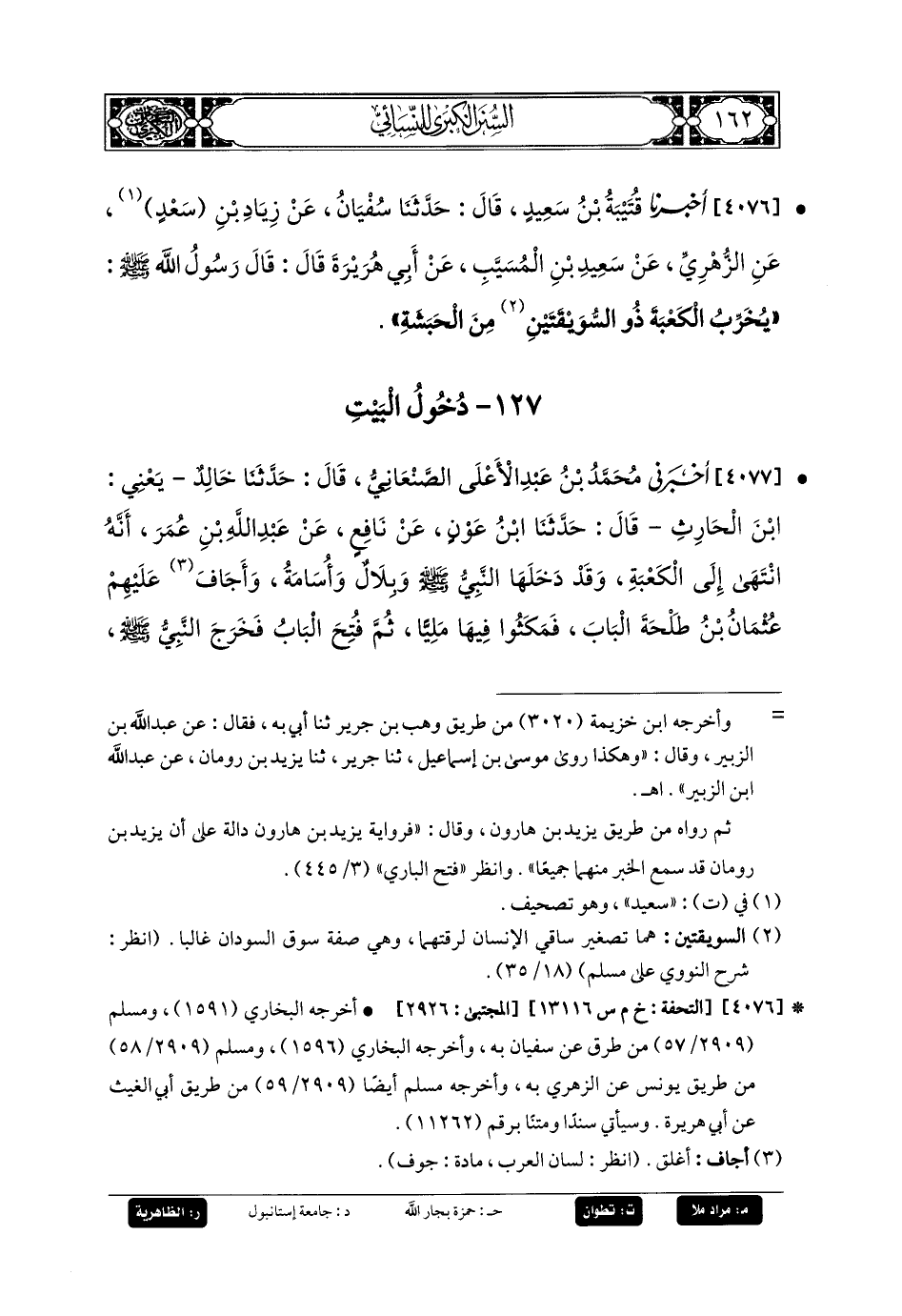 4076- أَخبَرنا قُتَيبَةُ بنُ سَعِيدٍ، قَالَ: حَدَّثنا سُفيانُ، عَن زِيَادِ بنِ سَعْدٍ، عَنِ الزُّهْرِيِّ، عَن سَعِيدِ بنِ المُسَيَّبِ، عَن أَبي هُرَيرَةَ، قَالَ: قَالَ رَسُولُ اللهِ صَلى الله عَليه وسَلم: يُخَرِّبُ الكَعْبَةَ ذُو السُّوَيْقَتَيْنِ مِنَ الحَبَشَةِ.