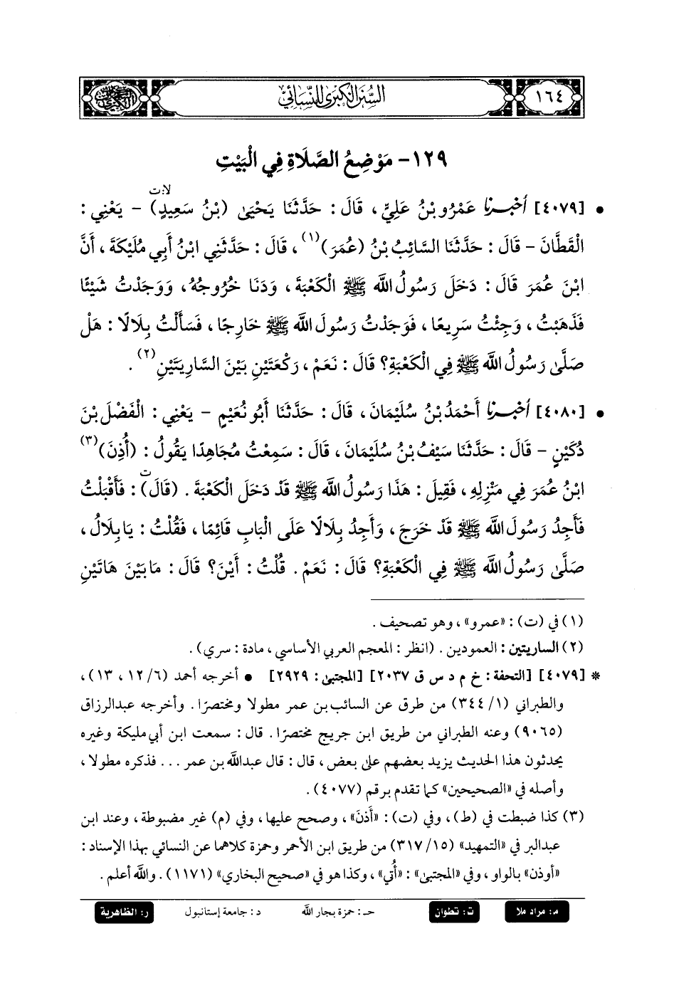 4080- أَخبَرنا أَحْمَدُ بنُ سُلَيمَانَ، قَالَ: حَدَّثنا أَبو نُعَيْمٍ، يَعْنِي الفَضْلَ بْنَ دُكَيْنٍ، قَالَ: حَدَّثنا سَيْفُ بنُ سُلَيمَانَ، قَالَ: سَمِعْتُ مُجَاهِدًا، يَقُولُ: أُذِنَ ابْنُ عُمَرَ فِي مَنْزِلِهِ، فَقِيلَ: هَذَا رَسُولُ اللهِ صَلى الله عَليه وسَلم قَدْ دَخَلَ الكَعْبَةَ، قَالَ: فَأَقْبَلْتُ فَأَجِدُ رَسُولَ اللهِ صَلى الله عَليه وسَلم قَدْ خَرَجَ، وَأَجِدُ بِلالاً عَلَى البَابِ قَائِمًا، فَقُلْتُ: يَا بِلالُ، صَلَّى رَسُولُ اللهِ صَلى الله عَليه وسَلم فِي الكَعْبَةِ؟ قَالَ: نَعَمْ، قُلْتُ: أَيْنَ؟ قَالَ: مَا بَيْنَ هَاتَيْنِ الأُسْطُوَانَتَيْنِ رَكْعَتَيْنِ، ثُمَّ خَرَجَ فَصَلَّى رَكْعَتَيْنِ فِي وَجْهِ الكَعْبَةِ.
