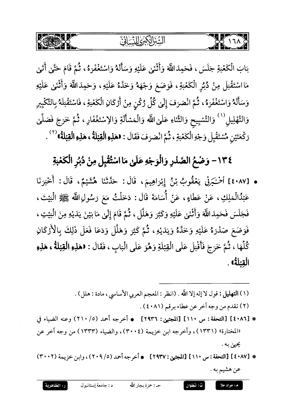 134- وَضْعُ الصَّدْرِ وَالوَجْهِ عَلَى مَا اسْتَقْبَلَ مِنْ دُبُرِ الكَعْبَةِ.