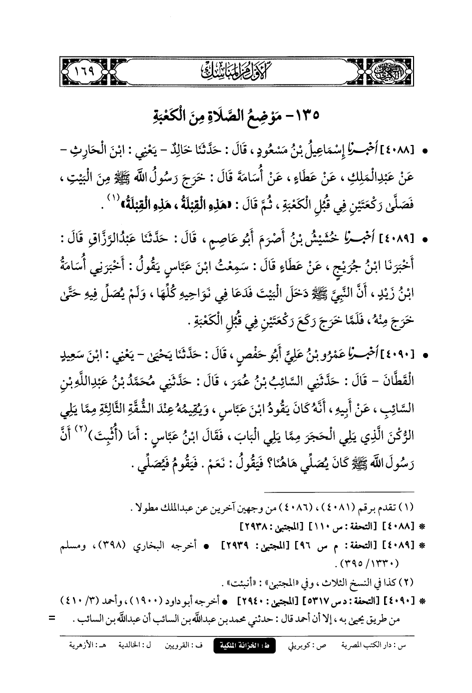 4089- أَخبَرنا خُشَيْشُ بنُ أَصْرَمَ أَبو عَاصِمٍ، قَالَ: حَدَّثنا عَبدُ الرَّزَّاقِ، قَالَ: أَخبَرنا ابْنُ جُرَيْجٍ، عَن عَطَاءٍ، قَالَ: سَمِعْتُ ابْنَ عَبَّاسٍ، يَقُولُ: أَخبَرني أُسَامَةُ بنُ زَيْدٍ، أَنَّ النَّبيَّ صَلى الله عَليه وسَلم دَخَلَ البَيْتَ فَدَعَا فِي نَوَاحِيهِ كُلِّهَا وَلَمْ يُصَلِّ فِيهِ حَتَّى خَرَجَ مِنْهُ، فَلَمَّا خَرَجَ رَكَعَ رَكْعَتَيْنِ فِي قُبُلِ الكَعْبَةِ.