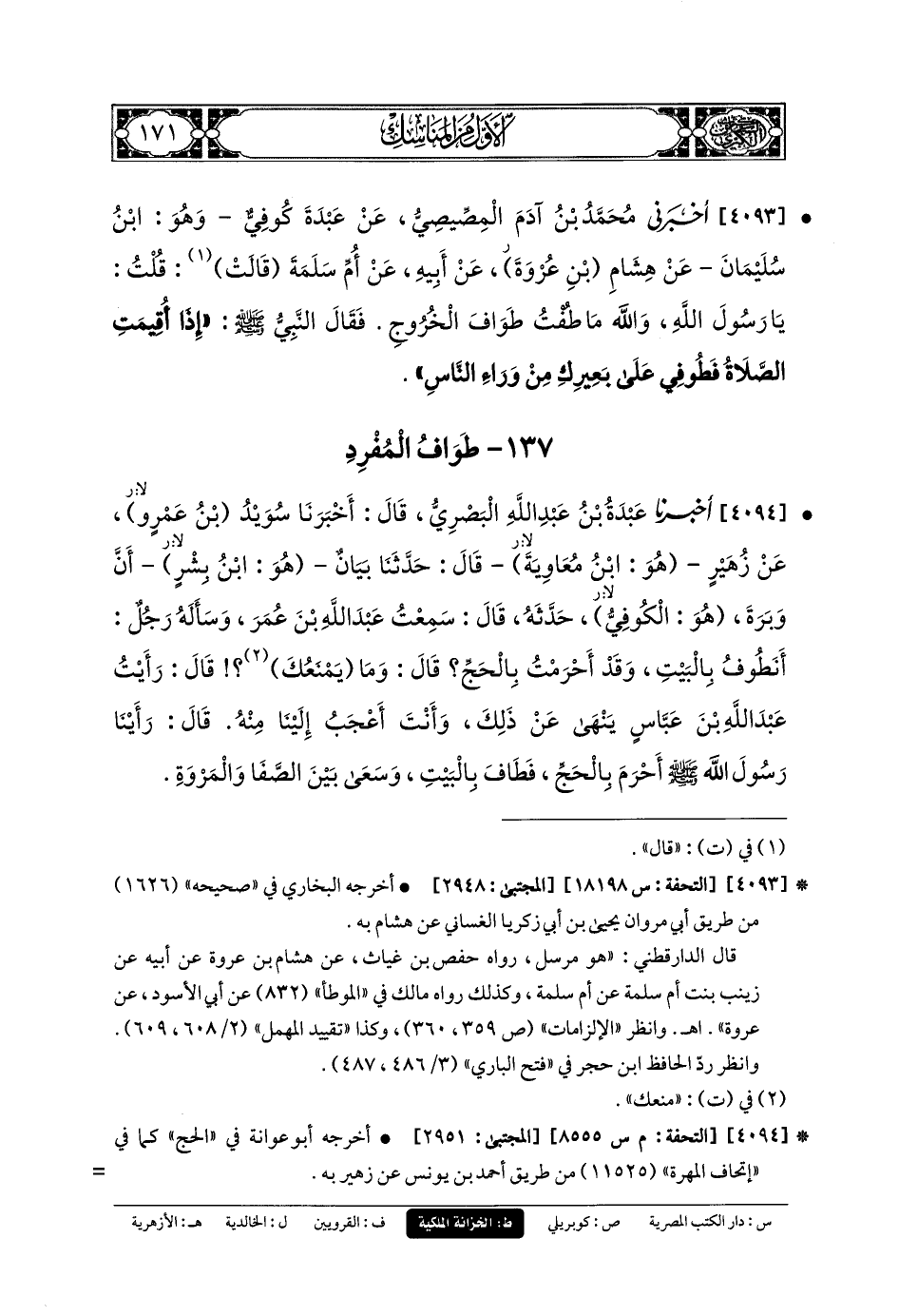 4093- أَخبَرني مُحَمدُ بنُ آدَمَ المِصِّيصِيُّ، عَن عَبدَةَ، كُوفِيٌّ، وَهُوَ ابْنُ سُلَيمَانَ، عَن هِشَامِ بنِ عُرْوَةَ، عَن أَبيهِ، عَن أُمِّ سَلَمَةَ، قَالَتْ: قُلْتُ: يَا رَسُولَ اللهِ، وَاللهِ مَا طُفْتُ طَوَافَ الخُرُوجِ، فَقَالَ النَّبيُّ صَلى الله عَليه وسَلم: إِذَا أُقِيمَتِ الصَّلاةُ فَطُوفِي عَلَى بَعِيرِكِ مِنْ وَرَاءِ النَّاسِ.