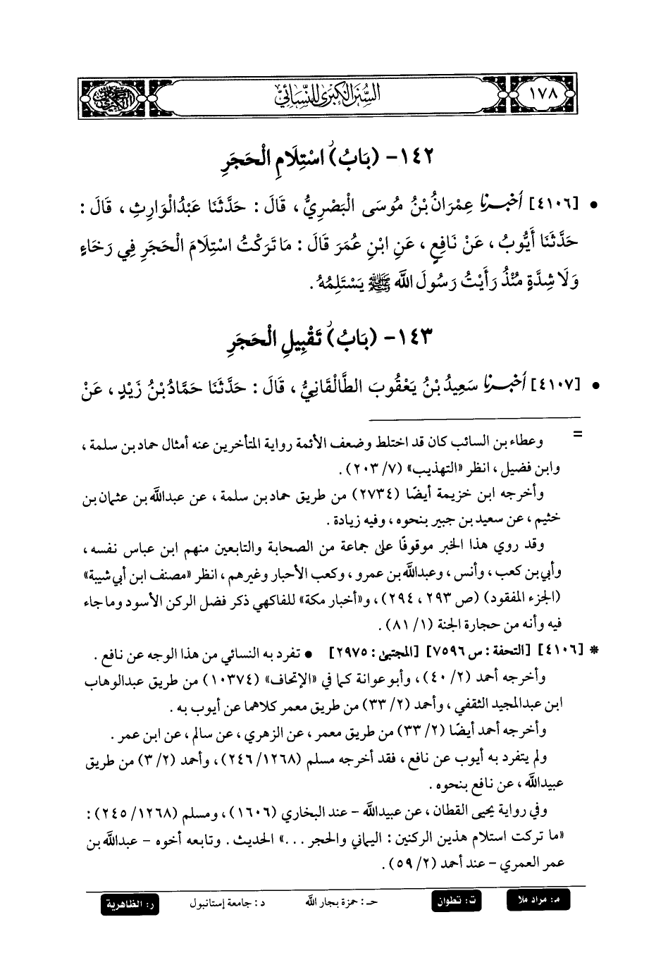 4106- أَخبَرنا عِمْرَانُ بنُ مُوسَى البَصْرِيُّ، قَالَ: حَدَّثنا عَبدُ الوَارِثِ، قَالَ: حَدَّثنا أَيوبُ، عَن نَافِعٍ، عَنِ ابنِ عُمَرَ، قَالَ: مَا تَرَكْتُ اسْتِلامَ الحَجَرِ فِي رَخَاءٍ وَلا شِدَّةٍ، مُنْذُ رَأَيْتُ رَسُولَ اللهِ صَلى الله عَليه وسَلم يَسْتَلِمُهُ.