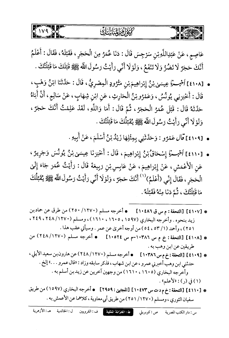 4108- أَخبَرنا عِيسَى بنُ إِبرَاهِيمَ بنِ مَثْرُودٍ المِصْرِيُّ، قَالَ: حَدَّثنا ابْنُ وَهْبٍ، قَالَ: أَخبَرني يُونُسُ، وَعَمرُو بنُ الحَارِثِ، عَنِ ابنِ شِهَابٍ، عَن سَالِمٍ، أَنَّ أَبَاهُ حَدَّثَهُ، قَالَ: قَبَّلَ عُمَرُ الحَجَرَ، ثُمَّ قَالَ: أَمَا وَاللهِ لَقَدْ عَلِمْتُ أَنَّكَ حَجَرٌ، وَلَوْلا أَنِّي رَأَيْتُ رَسُولَ اللهِ صَلى الله عَليه وسَلم يُقَبِّلُكَ مَا قَبَّلْتُكَ .