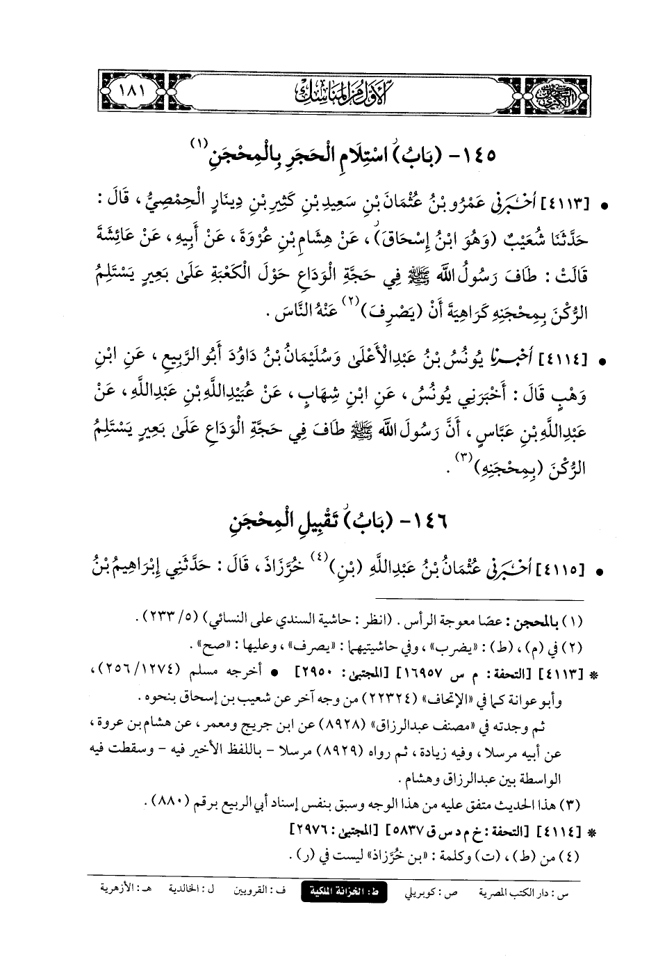 4113- أَخبَرني عَمرُو بنُ عُثْمَانَ بنِ سَعِيدِ بنِ كَثِيرِ بنِ دِينَارٍ الحِمْصِيُّ، قَالَ: حَدَّثنا شُعَيبٌ، وَهُوَ ابْنُ إِسحَاقَ، عَن هِشَامِ بنِ عُرْوَةَ، عَن أَبيهِ، عَن عَائِشَةَ، قَالَتْ: طَافَ رَسُولُ اللهِ صَلى الله عَليه وسَلم فِي حَجَّةِ الوَدَاعِ حَوْلَ الكَعْبَةِ عَلَى بَعِيرٍ لِيَسْتَلِمَ الرُّكْنَ بِمِحْجَنِهِ، كَرَاهِيَةَ أَنْ يُصْرَفُ عَنهُ النَّاسُ.