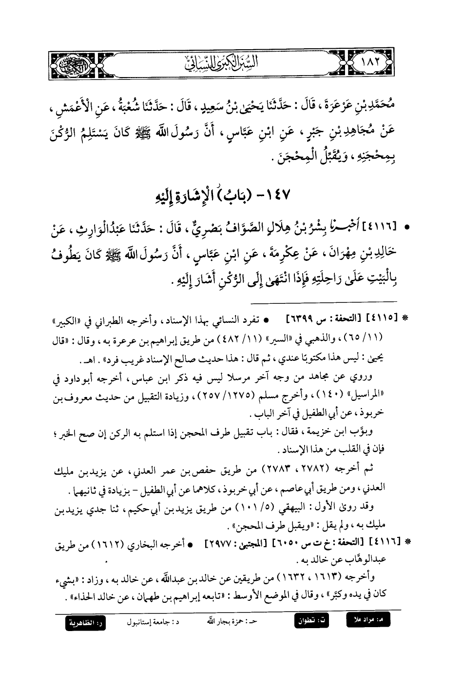 4116- أَخبَرنا بِشْرُ بنُ هِلالٍ الصَّوَّافُ، بَصْرِيٌّ، قَالَ: حَدَّثنا عَبدُ الوَارِثِ، عَن خَالِدِ بنِ مِهْرَانَ، عَن عِكْرِمَةَ، عَنِ ابنِ عَبَّاسٍ، أَنَّ رَسُولَ اللهِ صَلى الله عَليه وسَلم كَانَ يَطُوفُ بِالبَيْتِ عَلَى رَاحِلَتِهِ، فَإِذَا انْتَهَى إِلَى الرُّكْنِ أَشَارَ إِلَيْهِ.