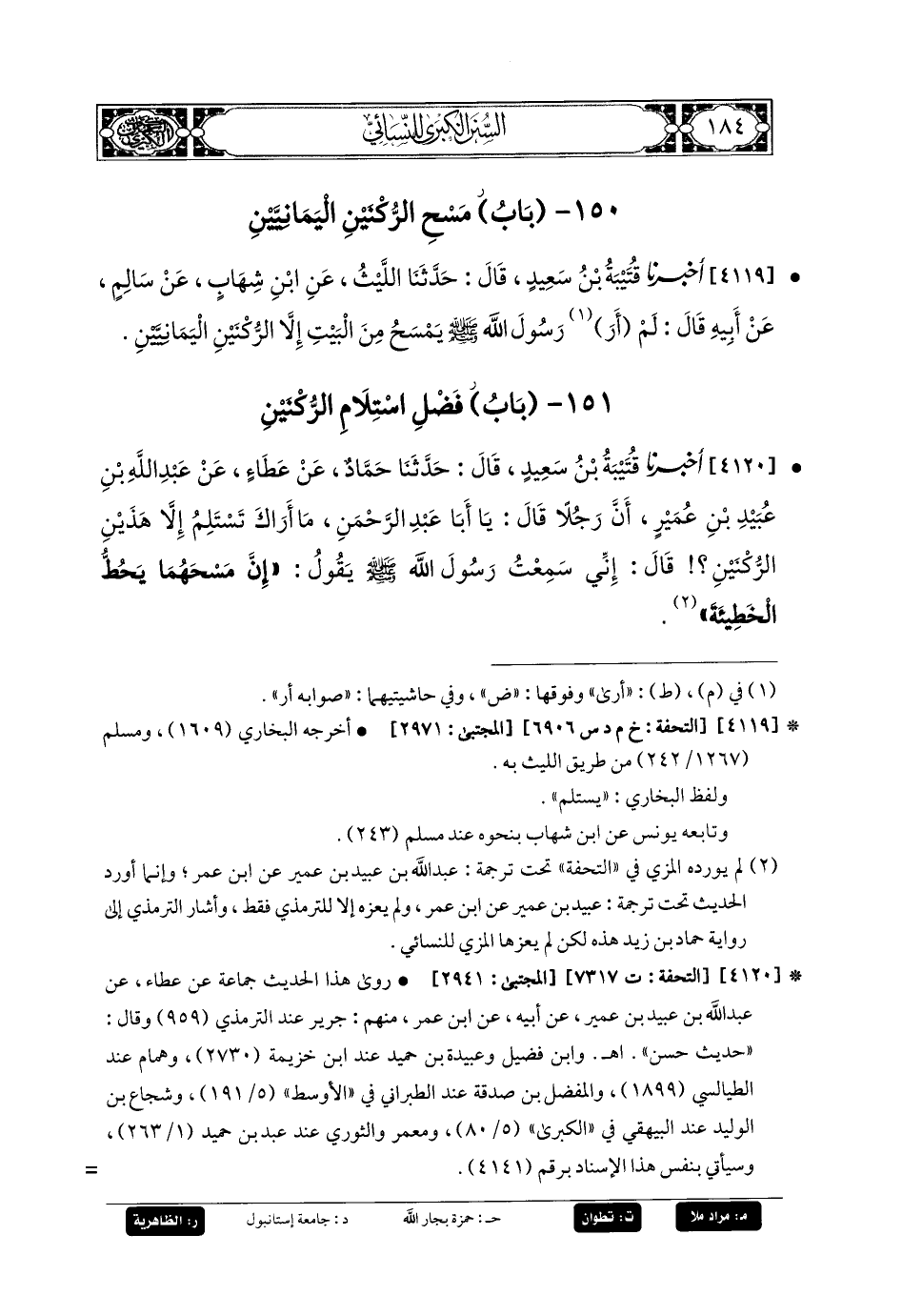 4120- أَخبَرنا قُتَيبَةُ بنُ سَعِيدٍ، قَالَ: حَدَّثنا حَمَّادٌ، عَن عَطَاءٍ، عَن عَبدِ اللهِ بنِ عُبَيدِ بنِ عُمَيْرٍ، أَنَّ رَجُلاً قَالَ: يَا أَبَا عَبدِ الرَّحمَنِ، مَا أَرَاكَ تَسْتَلِمُ إِلاَّ هَذَيْنِ الرُّكْنَيْنِ، قَالَ: إِنِّي سَمِعْتُ رَسُولَ اللهِ صَلى الله عَليه وسَلم يَقُولُ: إِنَّ مَسْحَهُمَا يَحُطُّ الخَطِيئَةَ.