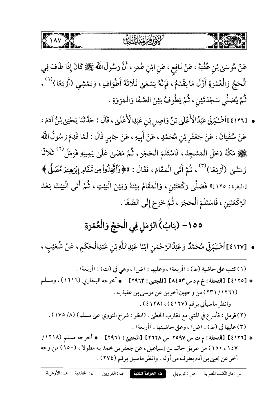 4127- أَخبَرني مُحَمدٌ، وَعَبدُ الرَّحمَنِ، ابْنَا عَبدِ اللهِ بنُ عَبدِ الحَكَمِ، عَن شُعَيبٍ، عَن أَبيهِ اللَّيْثِ، عَن كَثِيرِ بنِ فَرْقَدٍ، عَن نَافِعٍ، أَنَّ عَبدَ اللهِ بْنَ عُمَرَ كَانَ يَخُبُّ فِي طَوَافِهِ حِينَ يَقْدَمُ فِي حَجٍّ أَوْ عُمْرَةٍ ثَلاثًا، وَيَمْشِي أَرْبَعًا، قَالَ: وَكَانَ رَسُولُ اللهِ صَلى الله عَليه وسَلم يَفْعَلُ ذَلِكَ.