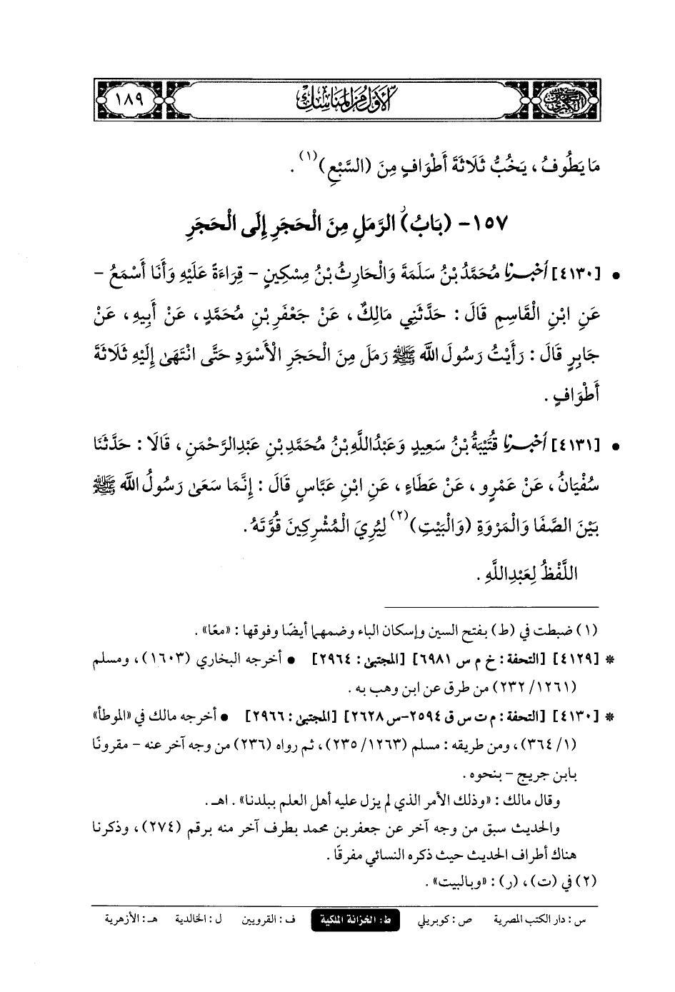 4130- أَخبَرنا مُحَمدُ بنُ سَلَمَةَ، وَالحَارِثُ بنُ مِسْكِينٍ، قِرَاءَةً عَلَيْهِ، وَأَنَا أَسْمَعُ، عَنِ ابنِ القَاسِمِ، قَالَ: حَدَّثني مَالِكٌ، عَن جَعفَرِ بنِ مُحَمدٍ، عَن أَبيهِ، عَن جَابِرٍ، قَالَ: رَأَيْتُ رَسُولَ اللهِ صَلى الله عَليه وسَلم رَمَلَ مِنَ الحَجَرِ الأَسْوَدِ حَتَّى انْتَهَى إِلَيْهِ ثَلاثَةَ أَطْوَافٍ.
