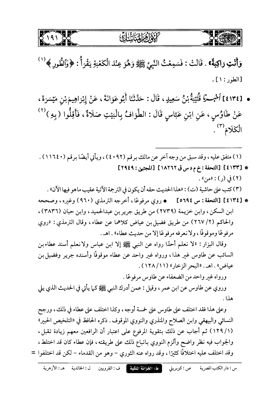 4134- أَخبَرنا قُتَيبَةُ بنُ سَعِيدٍ، قَالَ: حَدَّثنا أَبو عَوَانَةَ، عَن إِبرَاهِيمَ بنِ مَيْسَرَةَ، عَن طَاووُسٍ، عَنِ ابنِ عَبَّاسٍ، قَالَ: الطَّوَافُ بِالبَيْتِ صَلاةٌ، فَأَقِلُّوا بِهِ الكَلامَ.