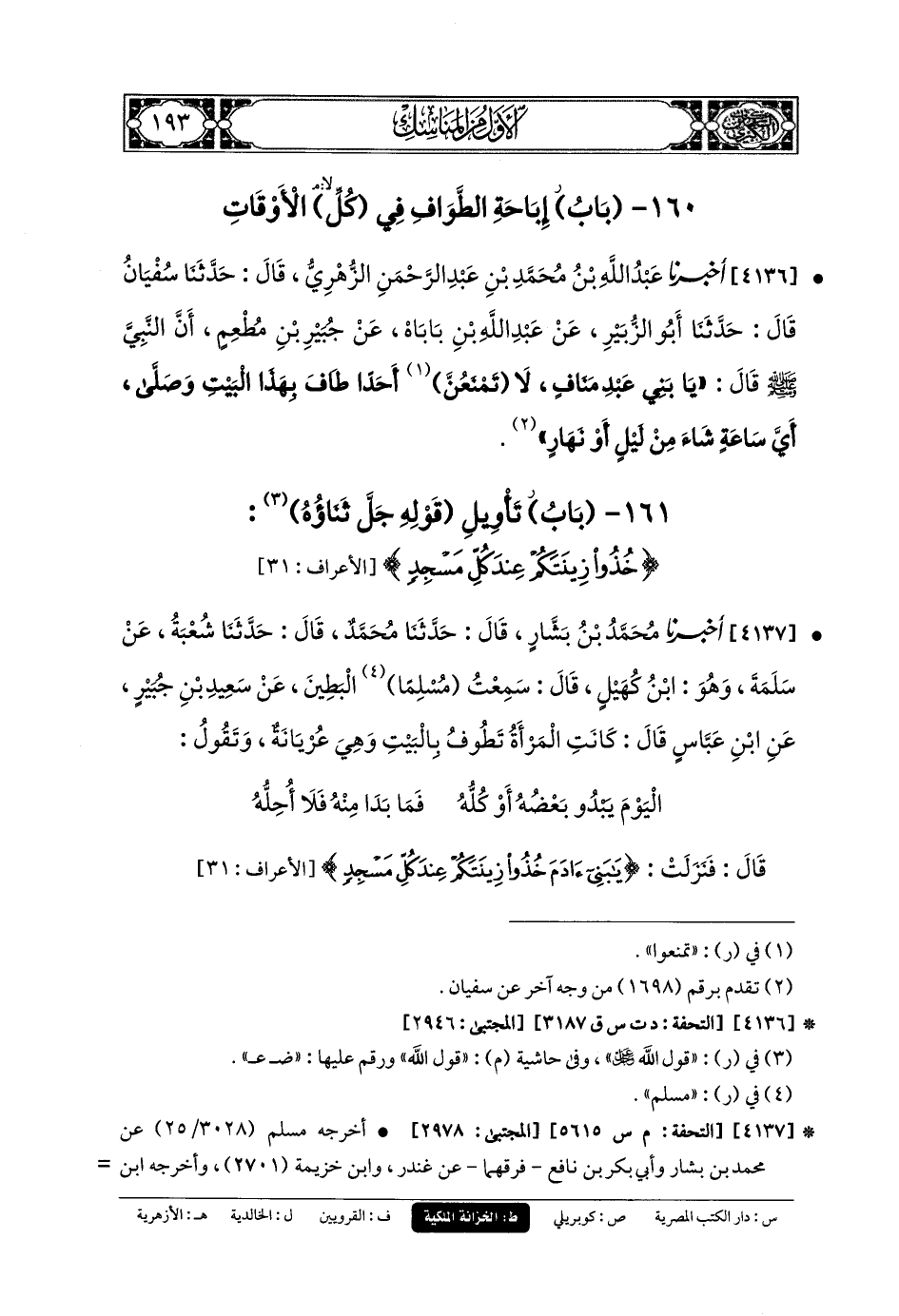 161- باب تَأْوِيلُ قَوْلِهِ جَلَّ ثَنَاؤُهُ: {خُذُوا زِينَتَكُمْ عِنْدَ كُلِّ مَسْجِدٍ}.