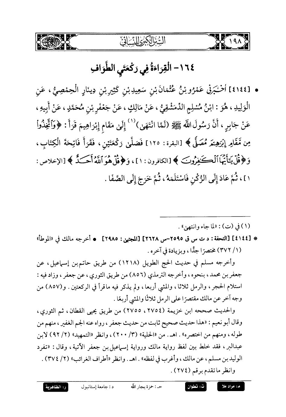 4144 - أَخبَرني عَمرُو بنُ عُثْمَانَ بنِ سَعِيدِ بنِ كَثِيرِ بنِ دِينَارٍ الحِمْصِيُّ، عَنِ الوَلِيدِ، هُوَ ابْنُ مُسْلِمٍ الدِّمَشْقِيُّ، عَن مَالِكٍ، عَن جَعفَرِ بنِ مُحَمدٍ، عَن أَبيهِ، عَن جَابِرٍ، أَنَّ رَسُولَ اللهِ صَلى الله عَليه وسَلم لَمَّا انْتَهَى إِلَى مَقَامِ إِبرَاهِيمَ قَرَأَ: {وَاتَّخِذُوا مِنْ مَقَامِ إِبرَاهِيمَ مُصَلًّى} فَصَلَّى رَكْعَتَيْنِ فَقَرَأَ فَاتِحَةَ الكِتَابِ، وَ {قُلْ يَا أَيُّهَا الكَافِرُونَ}، وَ {قُلْ هُوَ اللهُ أَحَدٌ}، ثُمَّ عَادَ إِلَى الرُّكْنِ فَاسْتَلَمَهُ، ثُمَّ خَرَجَ إِلَى الصَّفَا.